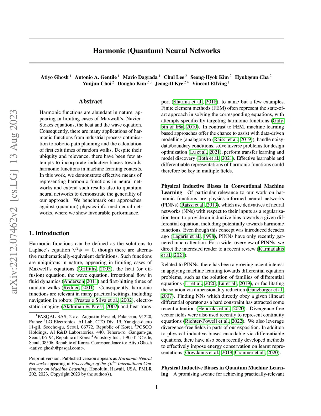 Harmonic functions are abundant in nature, appearing in limiting cases of Maxwell's, Navier-Stokes equations, the heat and the wave equation. Consequently, there are many applications of harmonic functions from industrial process optimisation to robotic path planning and the calculation of first exit times of random walks. Despite their ubiquity and relevance, there have been few attempts to incorporate inductive biases towards harmonic functions in machine learning contexts. In this work, we demonstrate effective means of representing harmonic functions in neural networks and extend such results also to quantum neural networks to demonstrate the generality of our approach. We benchmark our approaches against (quantum) physics-informed neural networks, where we show favourable performance.