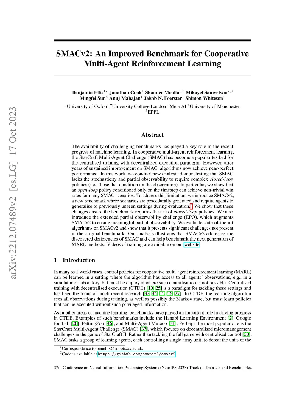 The availability of challenging benchmarks has played a key role in the recent progress of machine learning. In cooperative multi-agent reinforcement learning, the StarCraft Multi-Agent Challenge (SMAC) has become a popular testbed for centralised training with decentralised execution. However, after years of sustained improvement on SMAC, algorithms now achieve near-perfect performance. In this work, we conduct new analysis demonstrating that SMAC lacks the stochasticity and partial observability to require complex *closed-loop* policies. In particular, we show that an *open-loop* policy conditioned only on the timestep can achieve non-trivial win rates for many SMAC scenarios. To address this limitation, we introduce SMACv2, a new version of the benchmark where scenarios are procedurally generated and require agents to generalise to previously unseen settings (from the same distribution) during evaluation. We also introduce the extended partial observability challenge (EPO), which augments SMACv2 to ensure meaningful partial observability. We show that these changes ensure the benchmark requires the use of *closed-loop* policies. We evaluate state-of-the-art algorithms on SMACv2 and show that it presents significant challenges not present in the original benchmark. Our analysis illustrates that SMACv2 addresses the discovered deficiencies of SMAC and can help benchmark the next generation of MARL methods. Videos of training are available at https://sites.google.com/view/smacv2.
