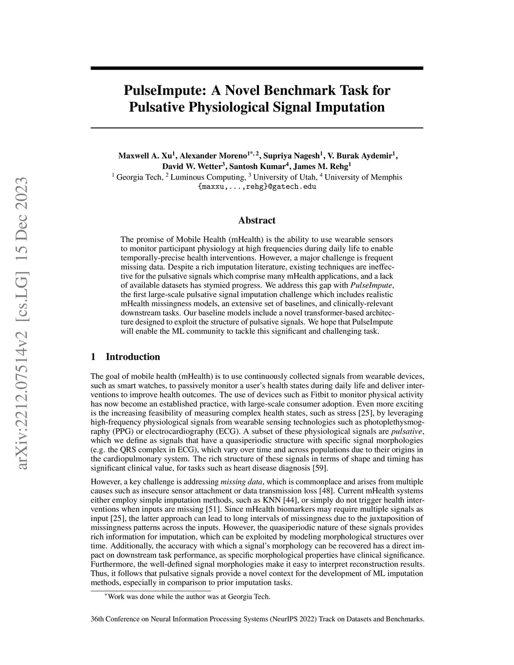 The promise of Mobile Health (mHealth) is the ability to use wearable sensors to monitor participant physiology at high frequencies during daily life to enable temporally-precise health interventions. However, a major challenge is frequent missing data. Despite a rich imputation literature, existing techniques are ineffective for the pulsative signals which comprise many mHealth applications, and a lack of available datasets has stymied progress. We address this gap with PulseImpute, the first large-scale pulsative signal imputation challenge which includes realistic mHealth missingness models, an extensive set of baselines, and clinically-relevant downstream tasks. Our baseline models include a novel transformer-based architecture designed to exploit the structure of pulsative signals. We hope that PulseImpute will enable the ML community to tackle this significant and challenging task.