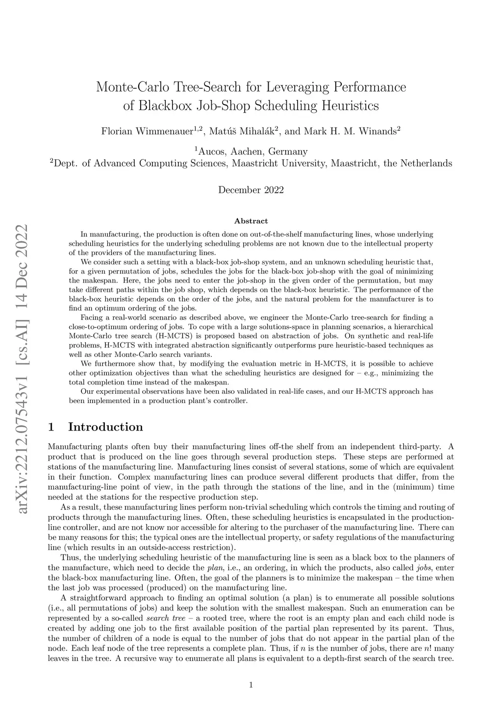 In manufacturing, the production is often done on out-of-the-shelf manufacturing lines, whose underlying scheduling heuristics are not known due to the intellectual property. We consider such a setting with a black-box job-shop system and an unknown scheduling heuristic that, for a given permutation of jobs, schedules the jobs for the black-box job-shop with the goal of minimizing the makespan. Here, the jobs need to enter the job-shop in the given order of the permutation, but may take different paths within the job shop, which depends on the black-box heuristic. The performance of the black-box heuristic depends on the order of the jobs, and the natural problem for the manufacturer is to find an optimum ordering of the jobs. Facing a real-world scenario as described above, we engineer the Monte-Carlo tree-search for finding a close-to-optimum ordering of jobs. To cope with a large solutions-space in planning scenarios, a hierarchical Monte-Carlo tree search (H-MCTS) is proposed based on abstraction of jobs. On synthetic and real-life problems, H-MCTS with integrated abstraction significantly outperforms pure heuristic-based techniques as well as other Monte-Carlo search variants. We furthermore show that, by modifying the evaluation metric in H-MCTS, it is possible to achieve other optimization objectives than what the scheduling heuristics are designed for -- e.g., minimizing the total completion time instead of the makespan. Our experimental observations have been also validated in real-life cases, and our H-MCTS approach has been implemented in a production plant's controller.