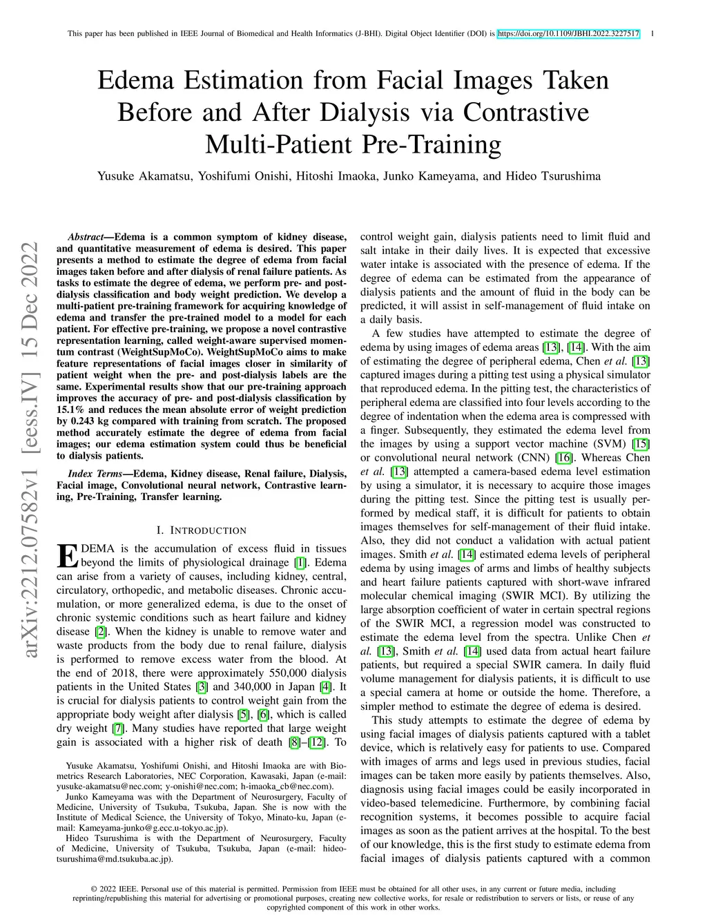 Edema is a common symptom of kidney disease, and quantitative measurement of edema is desired. This paper presents a method to estimate the degree of edema from facial images taken before and after dialysis of renal failure patients. As tasks to estimate the degree of edema, we perform pre- and post-dialysis classification and body weight prediction. We develop a multi-patient pre-training framework for acquiring knowledge of edema and transfer the pre-trained model to a model for each patient. For effective pre-training, we propose a novel contrastive representation learning, called weight-aware supervised momentum contrast (WeightSupMoCo). WeightSupMoCo aims to make feature representations of facial images closer in similarity of patient weight when the pre- and post-dialysis labels are the same. Experimental results show that our pre-training approach improves the accuracy of pre- and post-dialysis classification by 15.1% and reduces the mean absolute error of weight prediction by 0.243 kg compared with training from scratch. The proposed method accurately estimate the degree of edema from facial images; our edema estimation system could thus be beneficial to dialysis patients.