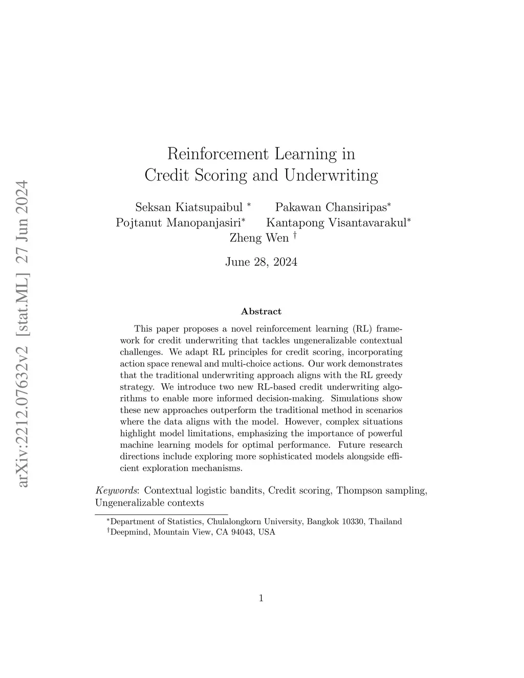 The application of reinforcement learning in credit scoring has created a unique setting for contextual logistic bandit that does not conform to the usual exploration-exploitation tradeoff but rather favors exploration-free algorithms. Through sufficient randomness in a pool of observable contexts, the reinforcement learning agent can simultaneously exploit an action with the highest reward while still learning more about the structure governing that environment. Thus, it is the case that greedy algorithms consistently outperform algorithms with efficient exploration, such as Thompson sampling. However, in a more pragmatic scenario in credit scoring, lenders can, to a degree, classify each borrower as a separate group, and learning about the characteristics of each group does not infer any information to another group. Through extensive simulations, we show that Thompson sampling dominates over greedy algorithms given enough timesteps which increase with the complexity of underlying features.