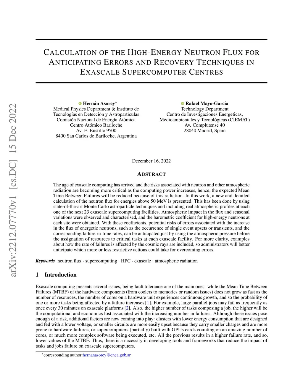 The age of exascale computing has arrived and the risks associated with neutron and other atmospheric radiation are becoming more critical as the computing power increases, hence, the expected Mean Time Between Failures will be reduced because of this radiation. In this work, a new and detailed calculation of the neutron flux for energies above 50 MeV is presented. This has been done by using state-of-the-art Monte Carlo astroparticle techniques and including real atmospheric profiles at each one of the next 23 exascale supercomputing facilities. Atmospheric impact in the flux and seasonal variations were observed and characterised, and the barometric coefficient for high-energy neutrons at each site was obtained. With these coefficients, potential risks of errors associated with the increase in the flux of energetic neutrons, such as the occurrence of single event upsets or transients, and the corresponding failure-in-time rates, can be anticipated just by using the atmospheric pressure before the assignation of resources to critical tasks at each exascale facility. For more clarity, examples about how the rate of failures is affected by the cosmic rays are included, so administrators will better anticipate which more or less restrictive actions could take for overcoming errors.