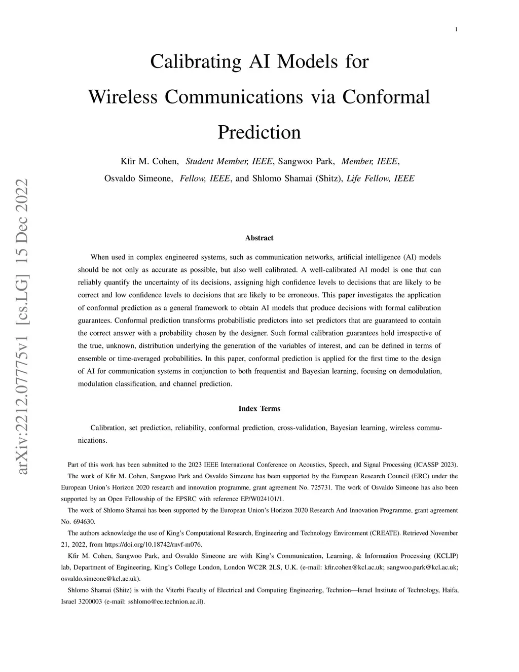 When used in complex engineered systems, such as communication networks, artificial intelligence (AI) models should be not only as accurate as possible, but also well calibrated. A well-calibrated AI model is one that can reliably quantify the uncertainty of its decisions, assigning high confidence levels to decisions that are likely to be correct and low confidence levels to decisions that are likely to be erroneous. This paper investigates the application of conformal prediction as a general framework to obtain AI models that produce decisions with formal calibration guarantees. Conformal prediction transforms probabilistic predictors into set predictors that are guaranteed to contain the correct answer with a probability chosen by the designer. Such formal calibration guarantees hold irrespective of the true, unknown, distribution underlying the generation of the variables of interest, and can be defined in terms of ensemble or time-averaged probabilities. In this paper, conformal prediction is applied for the first time to the design of AI for communication systems in conjunction to both frequentist and Bayesian learning, focusing on demodulation, modulation classification, and channel prediction.