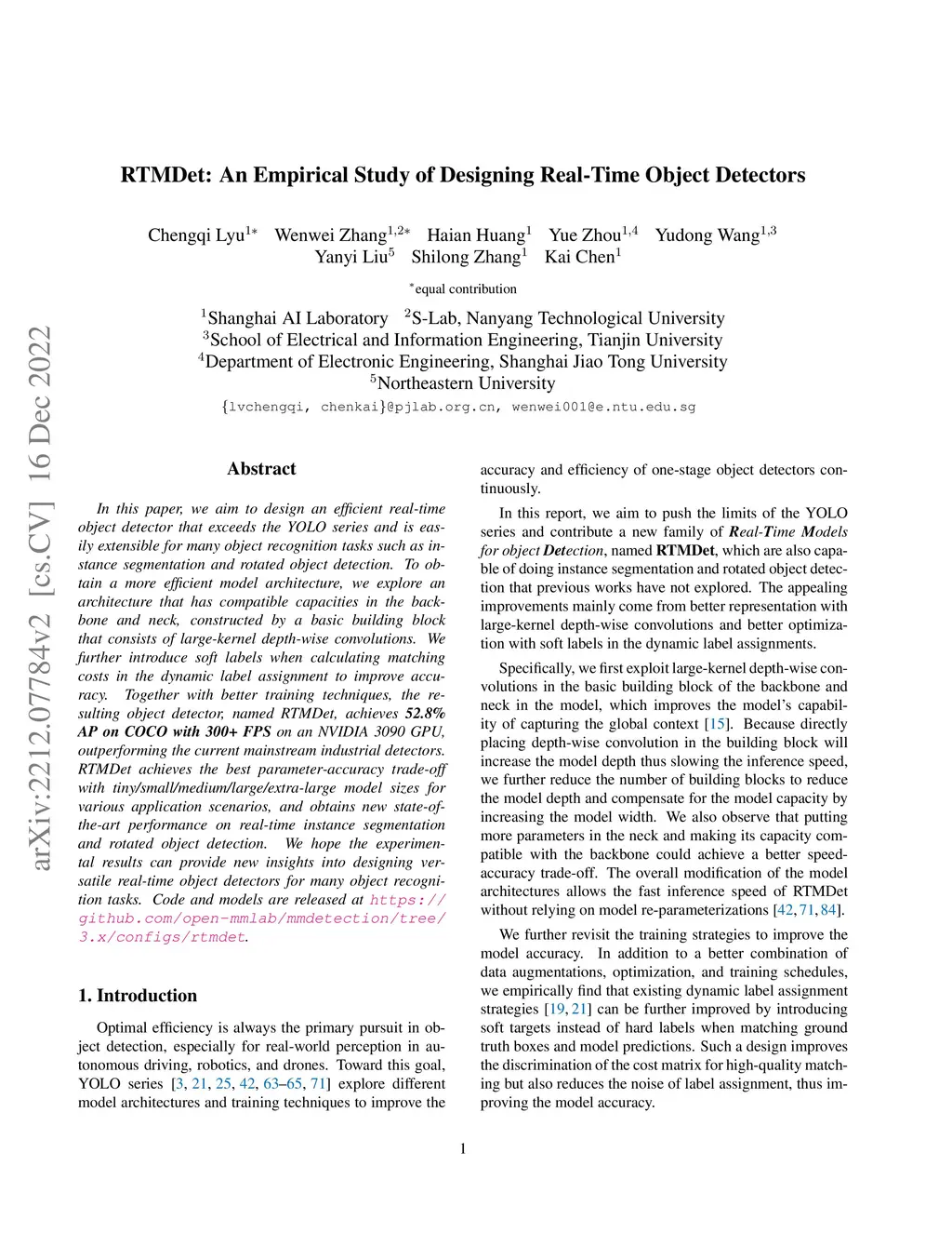 In this paper, we aim to design an efficient real-time object detector that exceeds the YOLO series and is easily extensible for many object recognition tasks such as instance segmentation and rotated object detection. To obtain a more efficient model architecture, we explore an architecture that has compatible capacities in the backbone and neck, constructed by a basic building block that consists of large-kernel depth-wise convolutions. We further introduce soft labels when calculating matching costs in the dynamic label assignment to improve accuracy. Together with better training techniques, the resulting object detector, named RTMDet, achieves 52.8% AP on COCO with 300+ FPS on an NVIDIA 3090 GPU, outperforming the current mainstream industrial detectors. RTMDet achieves the best parameter-accuracy trade-off with tiny/small/medium/large/extra-large model sizes for various application scenarios, and obtains new state-of-the-art performance on real-time instance segmentation and rotated object detection. We hope the experimental results can provide new insights into designing versatile real-time object detectors for many object recognition tasks. Code and models are released at https://github.com/open-mmlab/mmdetection/tree/3.x/configs/rtmdet.