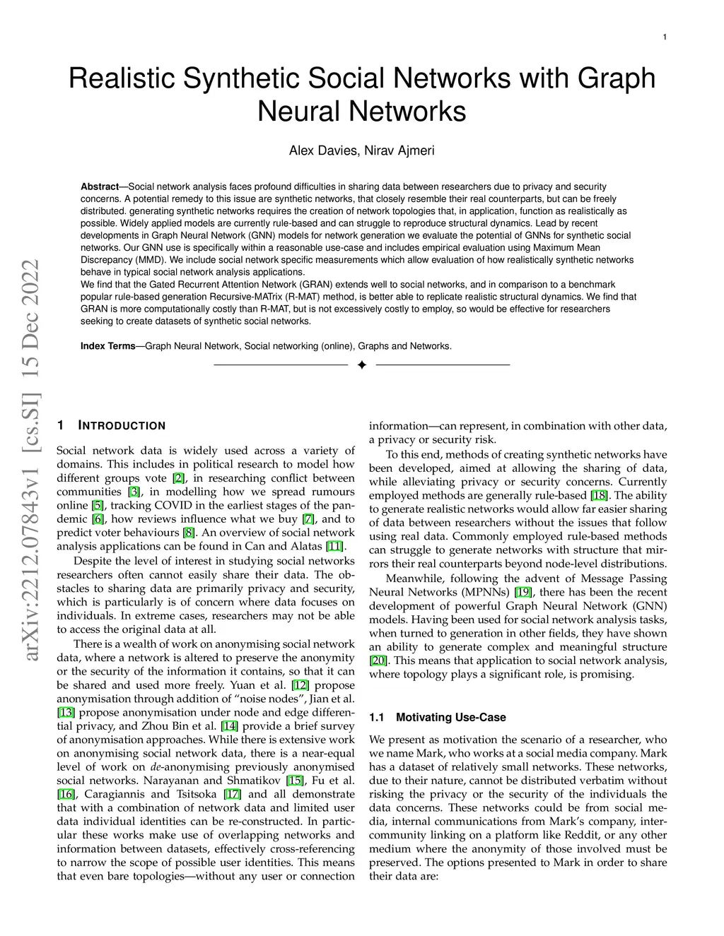 Social network analysis faces profound difficulties in sharing data between researchers due to privacy and security concerns. A potential remedy to this issue are synthetic networks, that closely resemble their real counterparts, but can be freely distributed. generating synthetic networks requires the creation of network topologies that, in application, function as realistically as possible. Widely applied models are currently rule-based and can struggle to reproduce structural dynamics. Lead by recent developments in Graph Neural Network (GNN) models for network generation we evaluate the potential of GNNs for synthetic social networks. Our GNN use is specifically within a reasonable use-case and includes empirical evaluation using Maximum Mean Discrepancy (MMD). We include social network specific measurements which allow evaluation of how realistically synthetic networks behave in typical social network analysis applications. We find that the Gated Recurrent Attention Network (GRAN) extends well to social networks, and in comparison to a benchmark popular rule-based generation Recursive-MATrix (R-MAT) method, is better able to replicate realistic structural dynamics. We find that GRAN is more computationally costly than R-MAT, but is not excessively costly to employ, so would be effective for researchers seeking to create datasets of synthetic social networks.