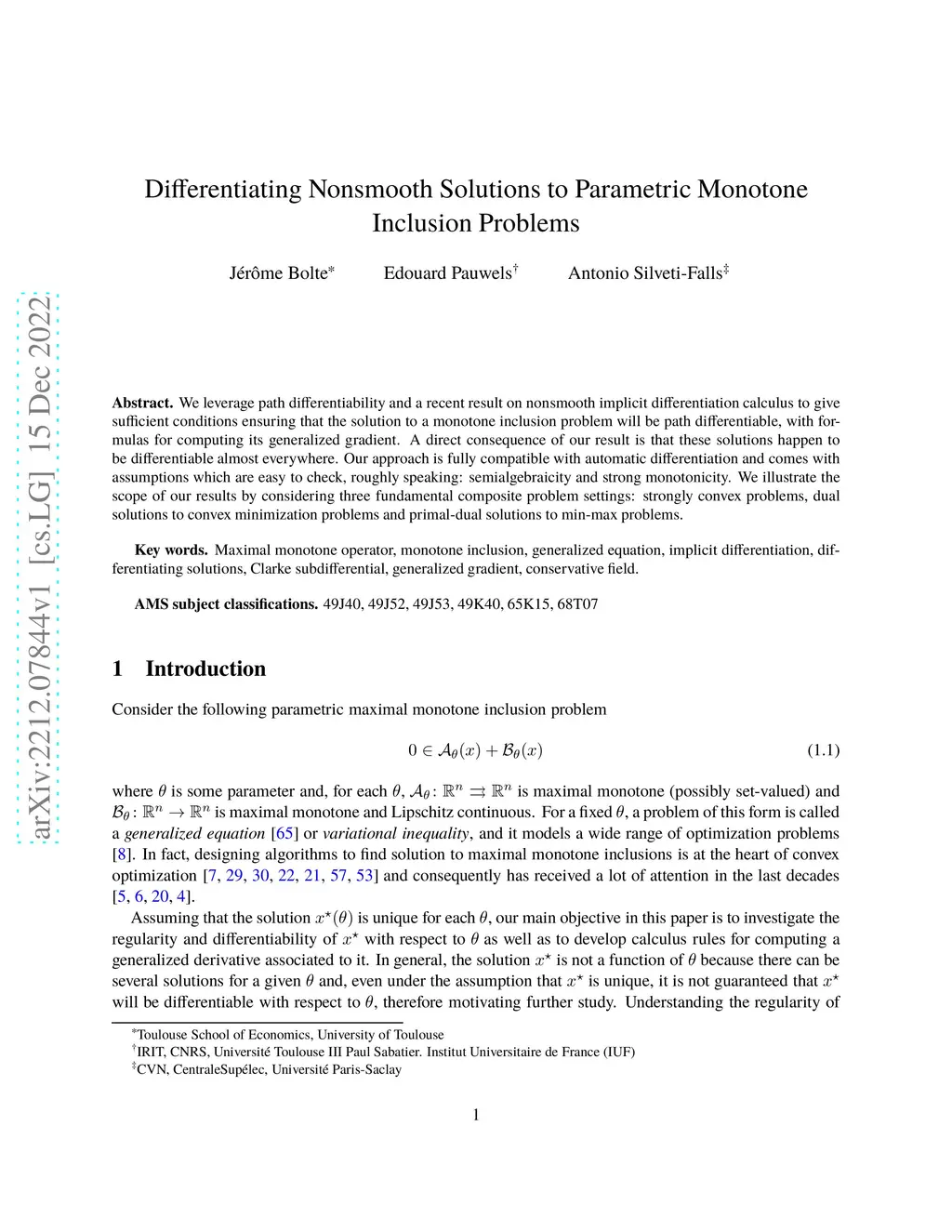We leverage path differentiability and a recent result on nonsmooth implicit differentiation calculus to give sufficient conditions ensuring that the solution to a monotone inclusion problem will be path differentiable, with formulas for computing its generalized gradient. A direct consequence of our result is that these solutions happen to be differentiable almost everywhere. Our approach is fully compatible with automatic differentiation and comes with assumptions which are easy to check, roughly speaking: semialgebraicity and strong monotonicity. We illustrate the scope of our results by considering three fundamental composite problem settings: strongly convex problems, dual solutions to convex minimization problems and primal-dual solutions to min-max problems.