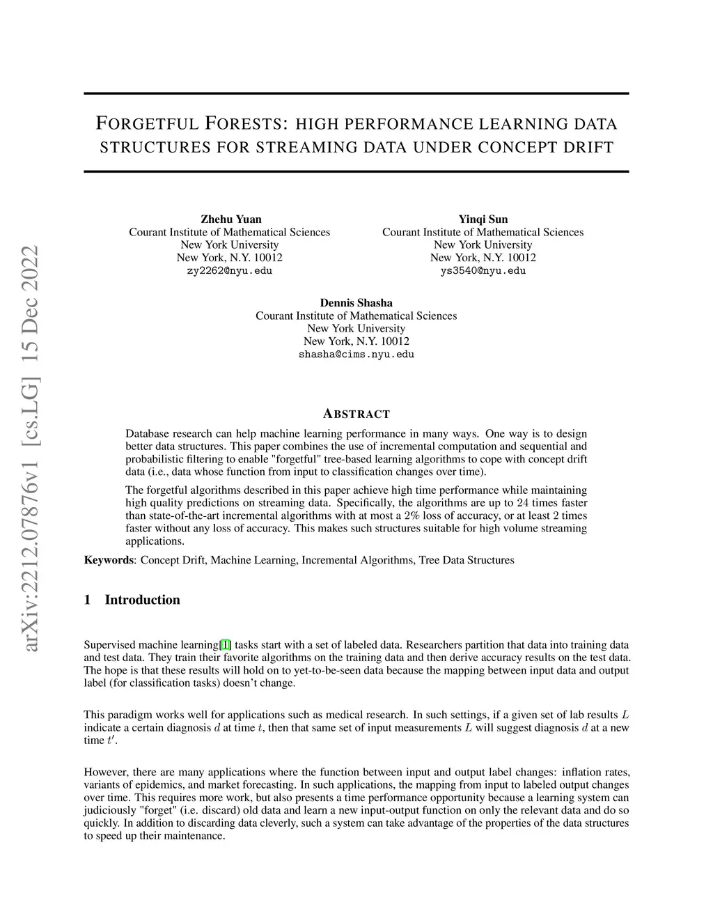 Database research can help machine learning performance in many ways. One way is to design better data structures. This paper combines the use of incremental computation and sequential and probabilistic filtering to enable "forgetful" tree-based learning algorithms to cope with concept drift data (i.e., data whose function from input to classification changes over time). The forgetful algorithms described in this paper achieve high time performance while maintaining high quality predictions on streaming data. Specifically, the algorithms are up to 24 times faster than state-of-the-art incremental algorithms with at most a 2% loss of accuracy, or at least twice faster without any loss of accuracy. This makes such structures suitable for high volume streaming applications.