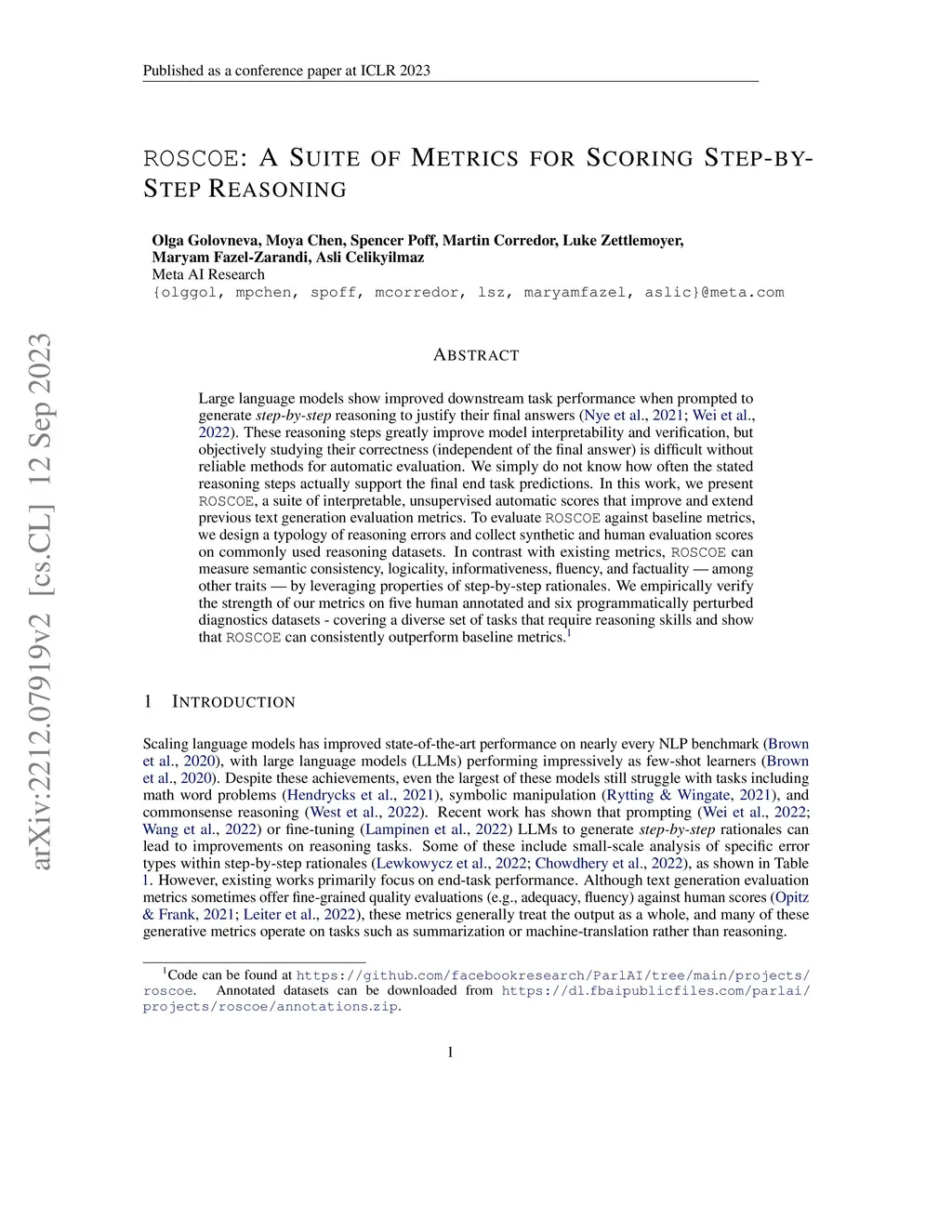 ROSCOE: A Suite of Metrics for Scoring Step-by-Step Reasoning