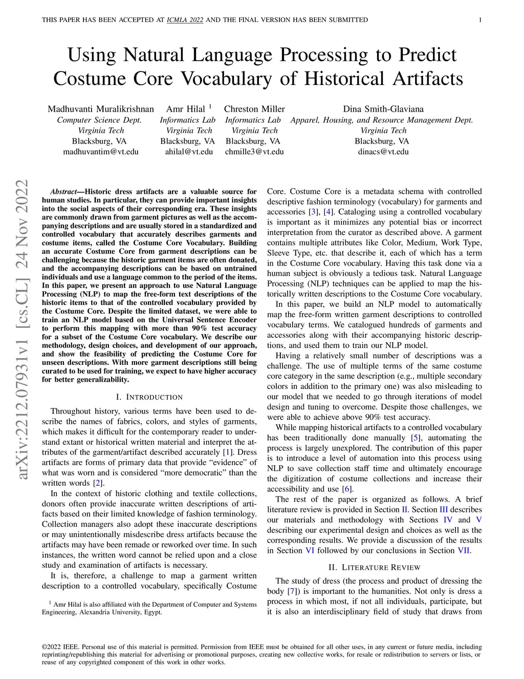 Historic dress artifacts are a valuable source for human studies. In particular, they can provide important insights into the social aspects of their corresponding era. These insights are commonly drawn from garment pictures as well as the accompanying descriptions and are usually stored in a standardized and controlled vocabulary that accurately describes garments and costume items, called the Costume Core Vocabulary. Building an accurate Costume Core from garment descriptions can be challenging because the historic garment items are often donated, and the accompanying descriptions can be based on untrained individuals and use a language common to the period of the items. In this paper, we present an approach to use Natural Language Processing (NLP) to map the free-form text descriptions of the historic items to that of the controlled vocabulary provided by the Costume Core. Despite the limited dataset, we were able to train an NLP model based on the Universal Sentence Encoder to perform this mapping with more than 90% test accuracy for a subset of the Costume Core vocabulary. We describe our methodology, design choices, and development of our approach, and show the feasibility of predicting the Costume Core for unseen descriptions. With more garment descriptions still being curated to be used for training, we expect to have higher accuracy for better generalizability.