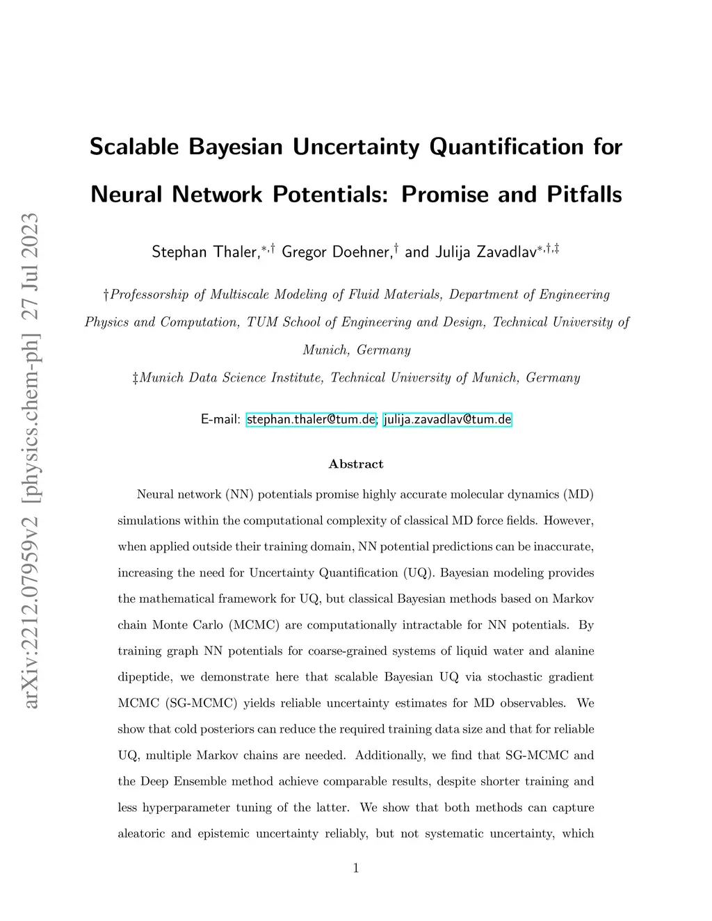 Neural network (NN) potentials promise highly accurate molecular dynamics (MD) simulations within the computational complexity of classical MD force fields. However, when applied outside their training domain, NN potential predictions can be inaccurate, increasing the need for Uncertainty Quantification (UQ). Bayesian modeling provides the mathematical framework for UQ, but classical Bayesian methods based on Markov chain Monte Carlo (MCMC) are computationally intractable for NN potentials. By training graph NN potentials for coarse-grained systems of liquid water and alanine dipeptide, we demonstrate here that scalable Bayesian UQ via stochastic gradient MCMC (SG-MCMC) yields reliable uncertainty estimates for MD observables. We show that cold posteriors can reduce the required training data size and that for reliable UQ, multiple Markov chains are needed. Additionally, we find that SG-MCMC and the Deep Ensemble method achieve comparable results, despite shorter training and less hyperparameter tuning of the latter. We show that both methods can capture aleatoric and epistemic uncertainty reliably, but not systematic uncertainty, which needs to be minimized by adequate modeling to obtain accurate credible intervals for MD observables. Our results represent a step towards accurate UQ that is of vital importance for trustworthy NN potential-based MD simulations required for decision-making in practice.