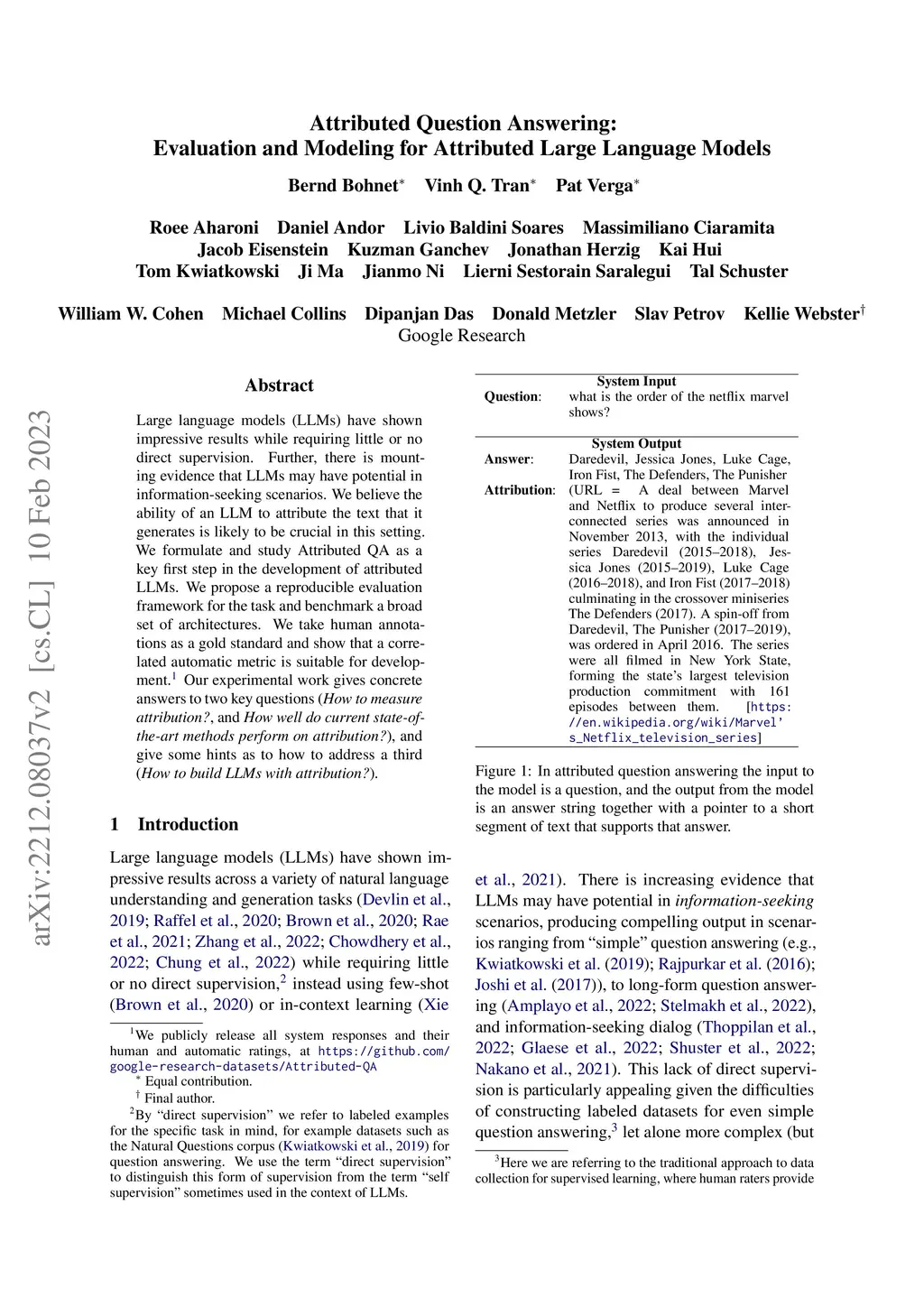 Attributed Question Answering: Evaluation and Modeling for Attributed