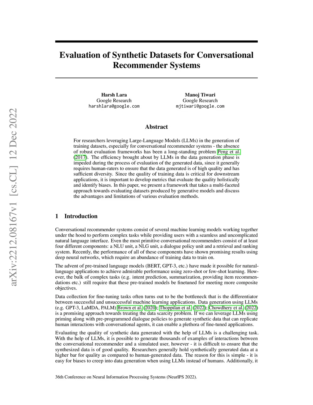 Evaluation of Synthetic Datasets for Conversational Recommender Systems