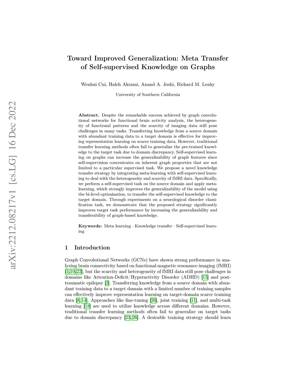 Despite the remarkable success achieved by graph convolutional networks for functional brain activity analysis, the heterogeneity of functional patterns and the scarcity of imaging data still pose challenges in many tasks. Transferring knowledge from a source domain with abundant training data to a target domain is effective for improving representation learning on scarce training data. However, traditional transfer learning methods often fail to generalize the pre-trained knowledge to the target task due to domain discrepancy. Self-supervised learning on graphs can increase the generalizability of graph features since self-supervision concentrates on inherent graph properties that are not limited to a particular supervised task. We propose a novel knowledge transfer strategy by integrating meta-learning with self-supervised learning to deal with the heterogeneity and scarcity of fMRI data. Specifically, we perform a self-supervised task on the source domain and apply meta-learning, which strongly improves the generalizability of the model using the bi-level optimization, to transfer the self-supervised knowledge to the target domain. Through experiments on a neurological disorder classification task, we demonstrate that the proposed strategy significantly improves target task performance by increasing the generalizability and transferability of graph-based knowledge.