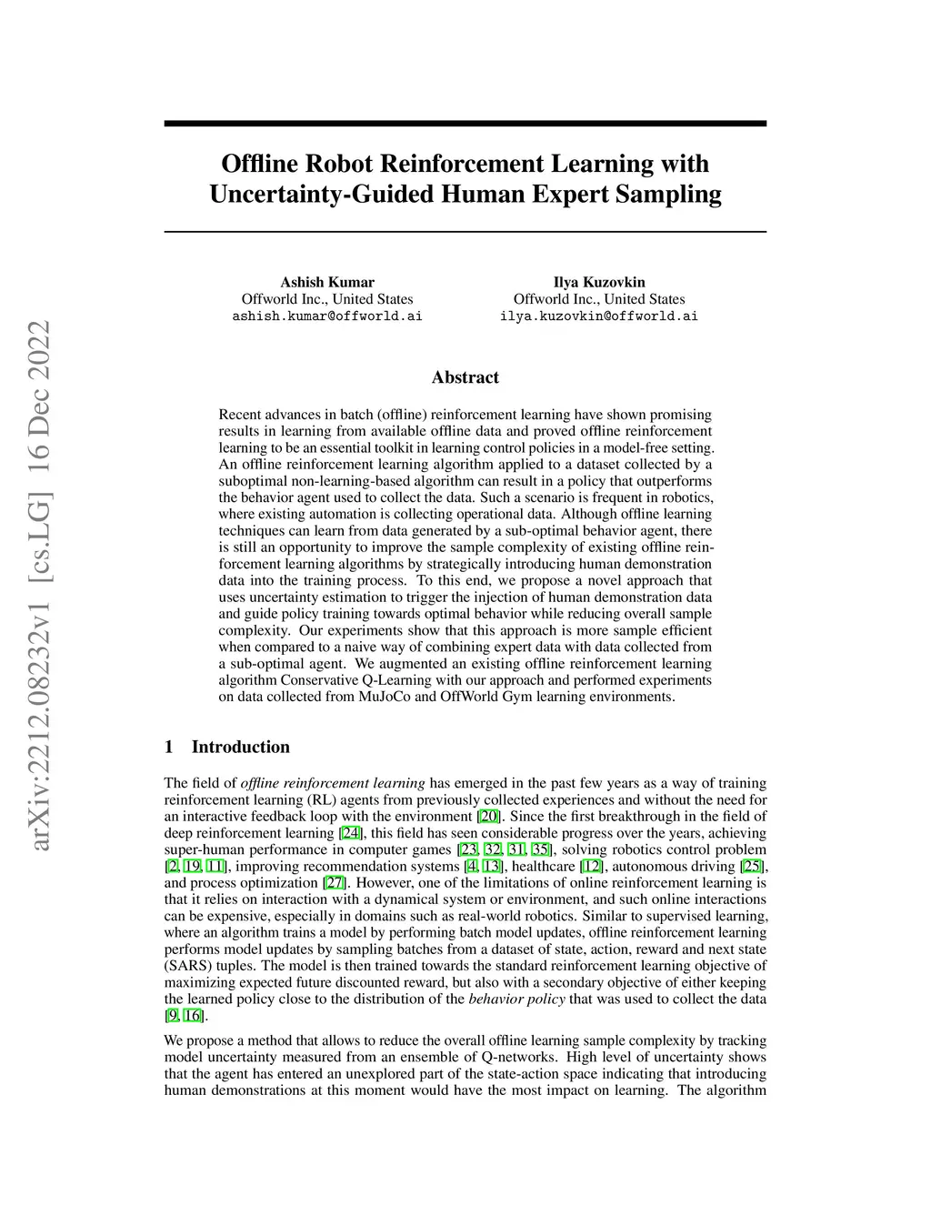 Recent advances in batch (offline) reinforcement learning have shown promising results in learning from available offline data and proved offline reinforcement learning to be an essential toolkit in learning control policies in a model-free setting. An offline reinforcement learning algorithm applied to a dataset collected by a suboptimal non-learning-based algorithm can result in a policy that outperforms the behavior agent used to collect the data. Such a scenario is frequent in robotics, where existing automation is collecting operational data. Although offline learning techniques can learn from data generated by a sub-optimal behavior agent, there is still an opportunity to improve the sample complexity of existing offline reinforcement learning algorithms by strategically introducing human demonstration data into the training process. To this end, we propose a novel approach that uses uncertainty estimation to trigger the injection of human demonstration data and guide policy training towards optimal behavior while reducing overall sample complexity. Our experiments show that this approach is more sample efficient when compared to a naive way of combining expert data with data collected from a sub-optimal agent. We augmented an existing offline reinforcement learning algorithm Conservative Q-Learning with our approach and performed experiments on data collected from MuJoCo and OffWorld Gym learning environments.