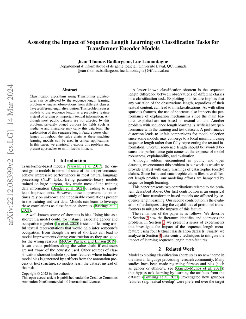 Classification algorithms using Transformer architectures can be affected by the sequence length learning problem whenever observations from different classes have a different length distribution. This problem causes models to use sequence length as a predictive feature instead of relying on important textual information. Although most public datasets are not affected by this problem, privately owned corpora for fields such as medicine and insurance may carry this data bias. The exploitation of this sequence length feature poses challenges throughout the value chain as these machine learning models can be used in critical applications. In this paper, we empirically expose this problem and present approaches to minimize its impacts.