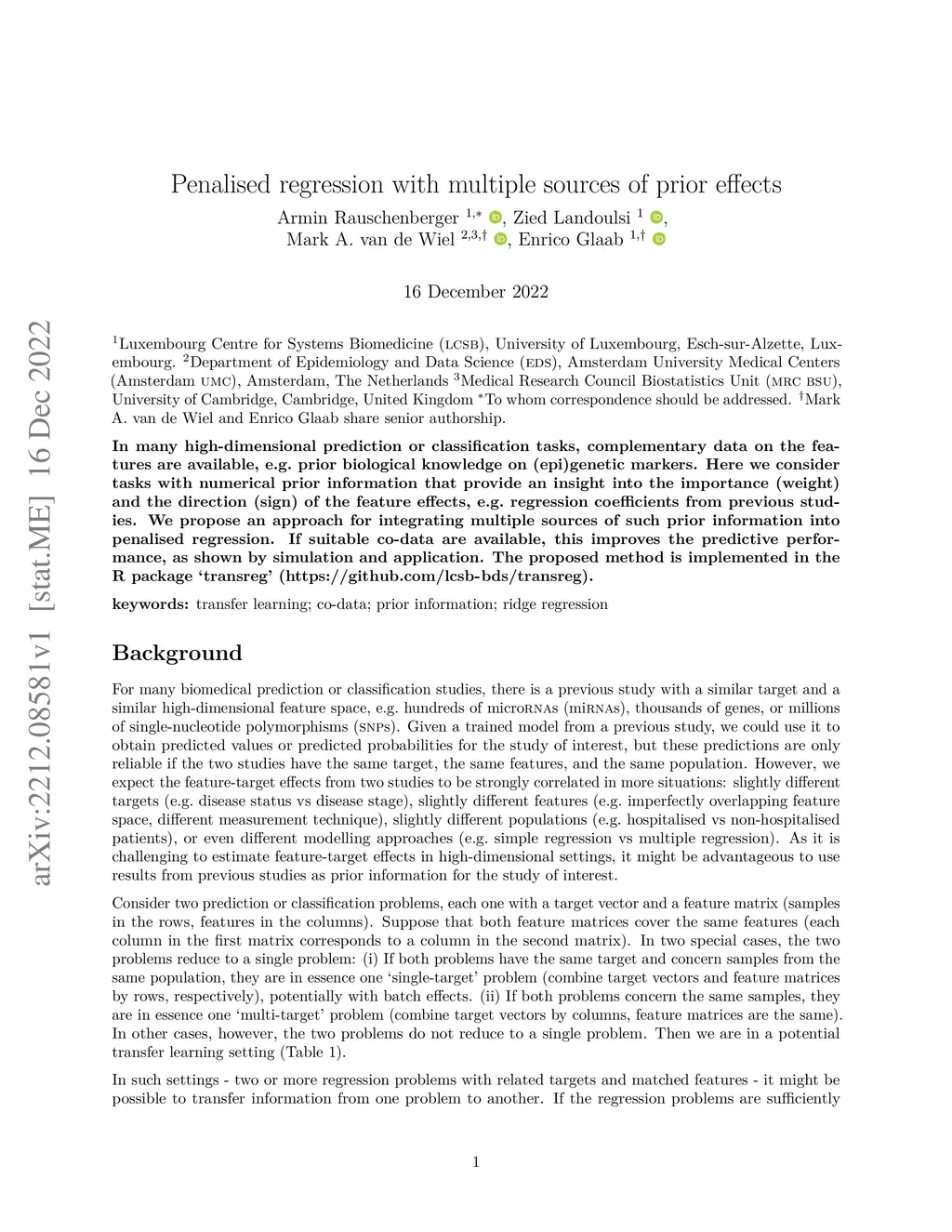 In many high-dimensional prediction or classification tasks, complementary data on the features are available, e.g. prior biological knowledge on (epi)genetic markers. Here we consider tasks with numerical prior information that provide an insight into the importance (weight) and the direction (sign) of the feature effects, e.g. regression coefficients from previous studies. We propose an approach for integrating multiple sources of such prior information into penalised regression. If suitable co-data are available, this improves the predictive performance, as shown by simulation and application. The proposed method is implemented in the R package `transreg' (https://github.com/lcsb-bds/transreg).