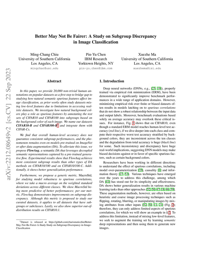 In this paper, we provide 20,000 non-trivial human annotations on popular datasets as a first step to bridge gap to studying how natural semantic spurious features affect image classification, as prior works often study datasets mixing low-level features due to limitations in accessing realistic datasets. We investigate how natural background colors play a role as spurious features by annotating the test sets of CIFAR10 and CIFAR100 into subgroups based on the background color of each image. We name our datasets \textbf{CIFAR10-B} and \textbf{CIFAR100-B} and integrate them with CIFAR-Cs. We find that overall human-level accuracy does not guarantee consistent subgroup performances, and the phenomenon remains even on models pre-trained on ImageNet or after data augmentation (DA). To alleviate this issue, we propose \textbf{FlowAug}, a \emph{semantic} DA that leverages decoupled semantic representations captured by a pre-trained generative flow. Experimental results show that FlowAug achieves more consistent subgroup results than other types of DA methods on CIFAR10/100 and on CIFAR10/100-C. Additionally, it shows better generalization performance. Furthermore, we propose a generic metric, \emph{MacroStd}, for studying model robustness to spurious correlations, where we take a macro average on the weighted standard deviations across different classes. We show \textit{MacroStd} being more predictive of better performances; per our metric, FlowAug demonstrates improvements on subgroup discrepancy. Although this metric is proposed to study our curated datasets, it applies to all datasets that have subgroups or subclasses. Lastly, we also show superior out-of-distribution results on CIFAR10.1.