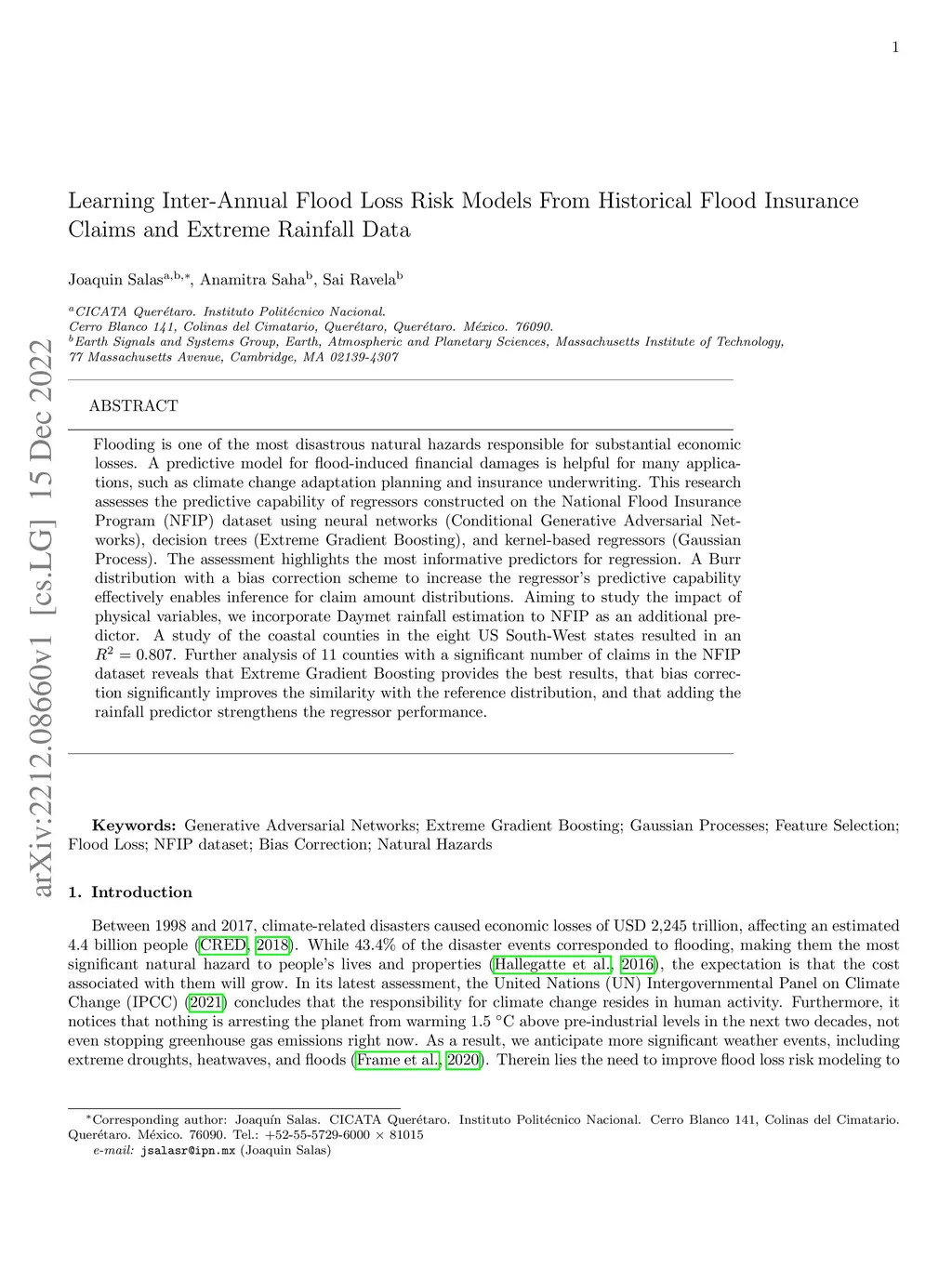 Flooding is one of the most disastrous natural hazards, responsible for substantial economic losses. A predictive model for flood-induced financial damages is useful for many applications such as climate change adaptation planning and insurance underwriting. This research assesses the predictive capability of regressors constructed on the National Flood Insurance Program (NFIP) dataset using neural networks (Conditional Generative Adversarial Networks), decision trees (Extreme Gradient Boosting), and kernel-based regressors (Gaussian Process). The assessment highlights the most informative predictors for regression. The distribution for claims amount inference is modeled with a Burr distribution permitting the introduction of a bias correction scheme and increasing the regressor's predictive capability. Aiming to study the interaction with physical variables, we incorporate Daymet rainfall estimation to NFIP as an additional predictor. A study on the coastal counties in the eight US South-West states resulted in an . Further analysis of 11 counties with a significant number of claims in the NFIP dataset reveals that Extreme Gradient Boosting provides the best results, that bias correction significantly improves the similarity with the reference distribution, and that the rainfall predictor strengthens the regressor performance.