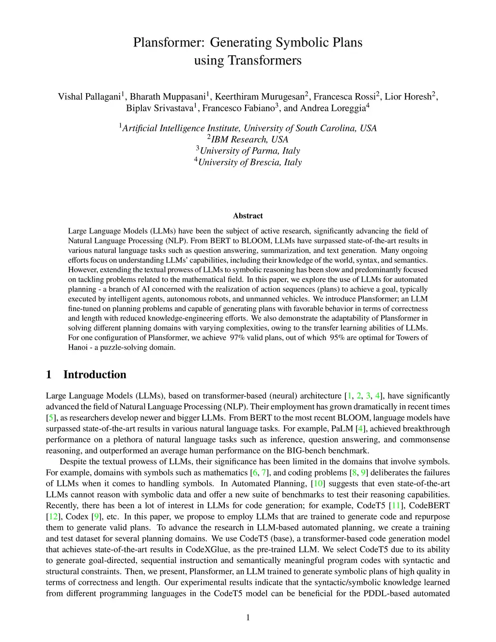 Large Language Models (LLMs) have been the subject of active research, significantly advancing the field of Natural Language Processing (NLP). From BERT to BLOOM, LLMs have surpassed state-of-the-art results in various natural language tasks such as question answering, summarization, and text generation. Many ongoing efforts focus on understanding LLMs' capabilities, including their knowledge of the world, syntax, and semantics. However, extending the textual prowess of LLMs to symbolic reasoning has been slow and predominantly focused on tackling problems related to the mathematical field. In this paper, we explore the use of LLMs for automated planning - a branch of AI concerned with the realization of action sequences (plans) to achieve a goal, typically executed by intelligent agents, autonomous robots, and unmanned vehicles. We introduce Plansformer; an LLM fine-tuned on planning problems and capable of generating plans with favorable behavior in terms of correctness and length with reduced knowledge-engineering efforts. We also demonstrate the adaptability of Plansformer in solving different planning domains with varying complexities, owing to the transfer learning abilities of LLMs. For one configuration of Plansformer, we achieve ~97% valid plans, out of which ~95% are optimal for Towers of Hanoi - a puzzle-solving domain.