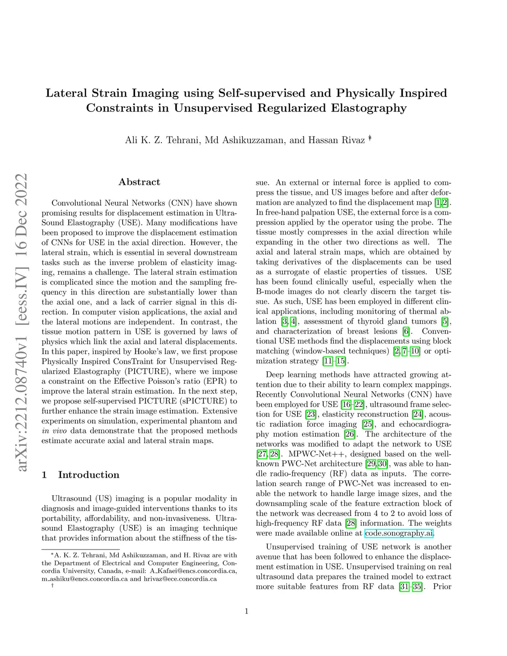 Convolutional Neural Networks (CNN) have shown promising results for displacement estimation in UltraSound Elastography (USE). Many modifications have been proposed to improve the displacement estimation of CNNs for USE in the axial direction. However, the lateral strain, which is essential in several downstream tasks such as the inverse problem of elasticity imaging, remains a challenge. The lateral strain estimation is complicated since the motion and the sampling frequency in this direction are substantially lower than the axial one, and a lack of carrier signal in this direction. In computer vision applications, the axial and the lateral motions are independent. In contrast, the tissue motion pattern in USE is governed by laws of physics which link the axial and lateral displacements. In this paper, inspired by Hooke's law, we first propose Physically Inspired ConsTraint for Unsupervised Regularized Elastography (PICTURE), where we impose a constraint on the Effective Poisson's ratio (EPR) to improve the lateral strain estimation. In the next step, we propose self-supervised PICTURE (sPICTURE) to further enhance the strain image estimation. Extensive experiments on simulation, experimental phantom and in vivo data demonstrate that the proposed methods estimate accurate axial and lateral strain maps.