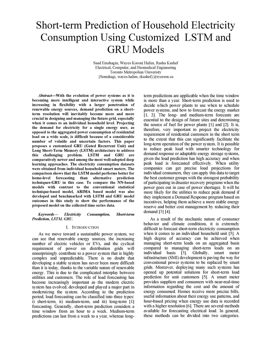 With the evolution of power systems as it is becoming more intelligent and interactive system while increasing in flexibility with a larger penetration of renewable energy sources, demand prediction on a short-term resolution will inevitably become more and more crucial in designing and managing the future grid, especially when it comes to an individual household level. Projecting the demand for electricity for a single energy user, as opposed to the aggregated power consumption of residential load on a wide scale, is difficult because of a considerable number of volatile and uncertain factors. This paper proposes a customized GRU (Gated Recurrent Unit) and Long Short-Term Memory (LSTM) architecture to address this challenging problem. LSTM and GRU are comparatively newer and among the most well-adopted deep learning approaches. The electricity consumption datasets were obtained from individual household smart meters. The comparison shows that the LSTM model performs better for home-level forecasting than alternative prediction techniques-GRU in this case. To compare the NN-based models with contrast to the conventional statistical technique-based model, ARIMA based model was also developed and benchmarked with LSTM and GRU model outcomes in this study to show the performance of the proposed model on the collected time series data.