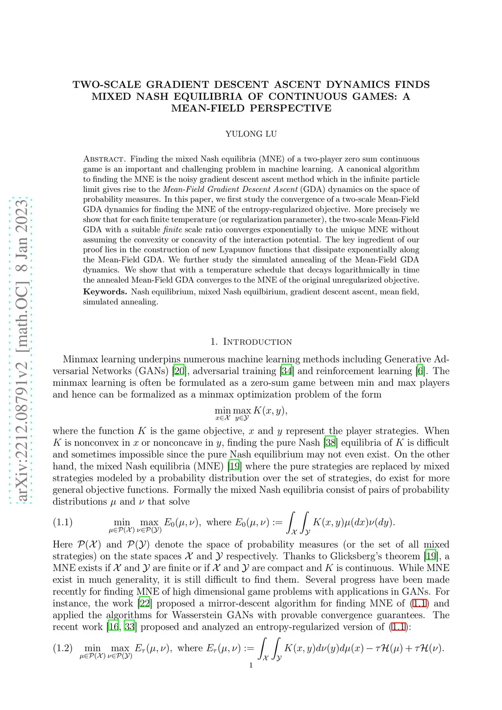 Finding the mixed Nash equilibria (MNE) of a two-player zero sum continuous game is an important and challenging problem in machine learning. A canonical algorithm to finding the MNE is the noisy gradient descent ascent method which in the infinite particle limit gives rise to the {\em Mean-Field Gradient Descent Ascent} (GDA) dynamics on the space of probability measures. In this paper, we first study the convergence of a two-scale Mean-Field GDA dynamics for finding the MNE of the entropy-regularized objective. More precisely we show that for each finite temperature (or regularization parameter), the two-scale Mean-Field GDA with a suitable {\em finite} scale ratio converges exponentially to the unique MNE without assuming the convexity or concavity of the interaction potential. The key ingredient of our proof lies in the construction of new Lyapunov functions that dissipate exponentially along the Mean-Field GDA. We further study the simulated annealing of the Mean-Field GDA dynamics. We show that with a temperature schedule that decays logarithmically in time the annealed Mean-Field GDA converges to the MNE of the original unregularized objective.
