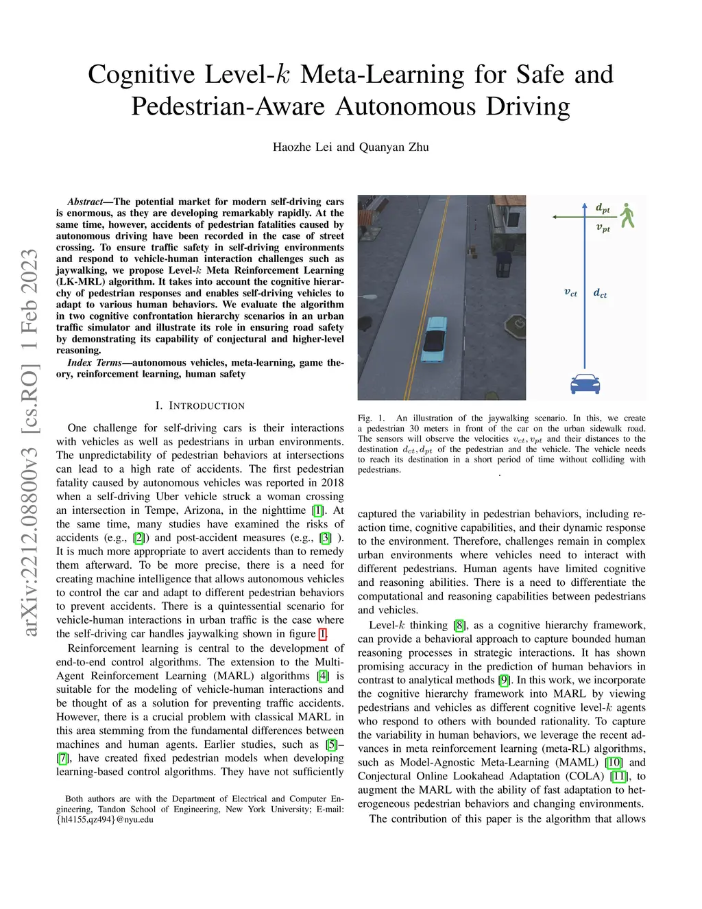 The potential market for modern self-driving cars is enormous, as they are developing remarkably rapidly. At the same time, however, accidents of pedestrian fatalities caused by autonomous driving have been recorded in the case of street crossing. To ensure traffic safety in self-driving environments and respond to vehicle-human interaction challenges such as jaywalking, we propose Level- Meta Reinforcement Learning (LK-MRL) algorithm. It takes into account the cognitive hierarchy of pedestrian responses and enables self-driving vehicles to adapt to various human behaviors. %which takes into account pedestrian responses while learning the optimal strategies. As a self-driving vehicle algorithm, the LK-MRL combines level- thinking into MAML to prepare for heterogeneous pedestrians and improve intersection safety based on the combination of meta-reinforcement learning and human cognitive hierarchy framework. We evaluate the algorithm in two cognitive confrontation hierarchy scenarios in an urban traffic simulator and illustrate its role in ensuring road safety by demonstrating its capability of conjectural and higher-level reasoning.