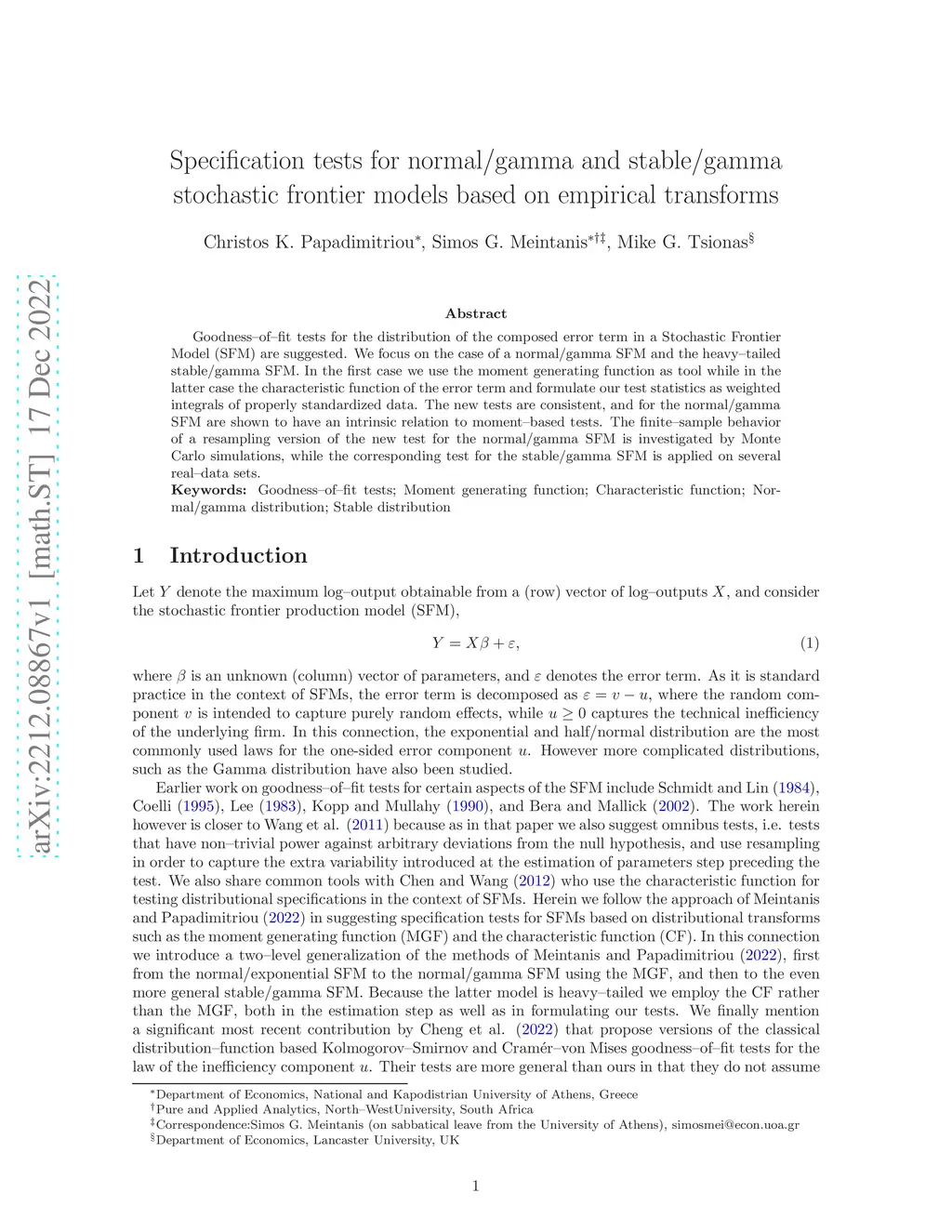Goodness-of-fit tests for the distribution of the composed error term in a Stochastic Frontier Model (SFM) are suggested. We focus on the case of a normal/gamma SFM and the heavy-tailed stable/gamma SFM. In the first case we use the moment generating function as tool while in the latter case the characteristic function of the error term and formulate our test statistics as weighted integrals of properly standardized data. The new tests are consistent, and for the normal/gamma SFM are shown to have an intrinsic relation to moment-based tests. The finite-sample behavior of a resampling version of the new test for the normal/gamma SFM is investigated by Monte Carlo simulations, while the corresponding test for the stable/gamma SFM is applied on several real-data sets.