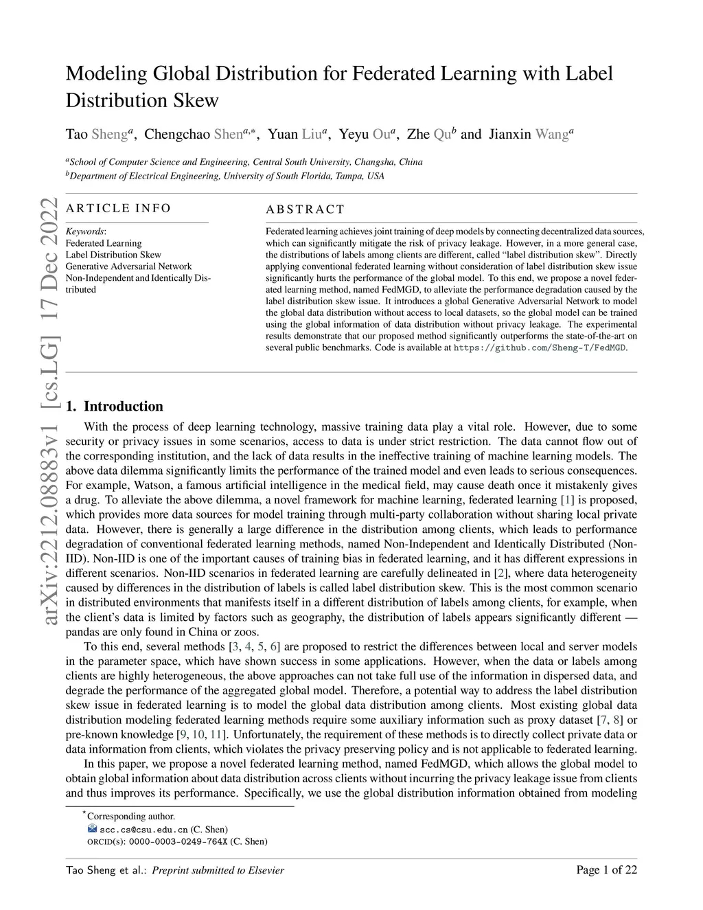 Federated learning achieves joint training of deep models by connecting decentralized data sources, which can significantly mitigate the risk of privacy leakage. However, in a more general case, the distributions of labels among clients are different, called ``label distribution skew''. Directly applying conventional federated learning without consideration of label distribution skew issue significantly hurts the performance of the global model. To this end, we propose a novel federated learning method, named FedMGD, to alleviate the performance degradation caused by the label distribution skew issue. It introduces a global Generative Adversarial Network to model the global data distribution without access to local datasets, so the global model can be trained using the global information of data distribution without privacy leakage. The experimental results demonstrate that our proposed method significantly outperforms the state-of-the-art on several public benchmarks. Code is available at \url{https://github.com/Sheng-T/FedMGD}.