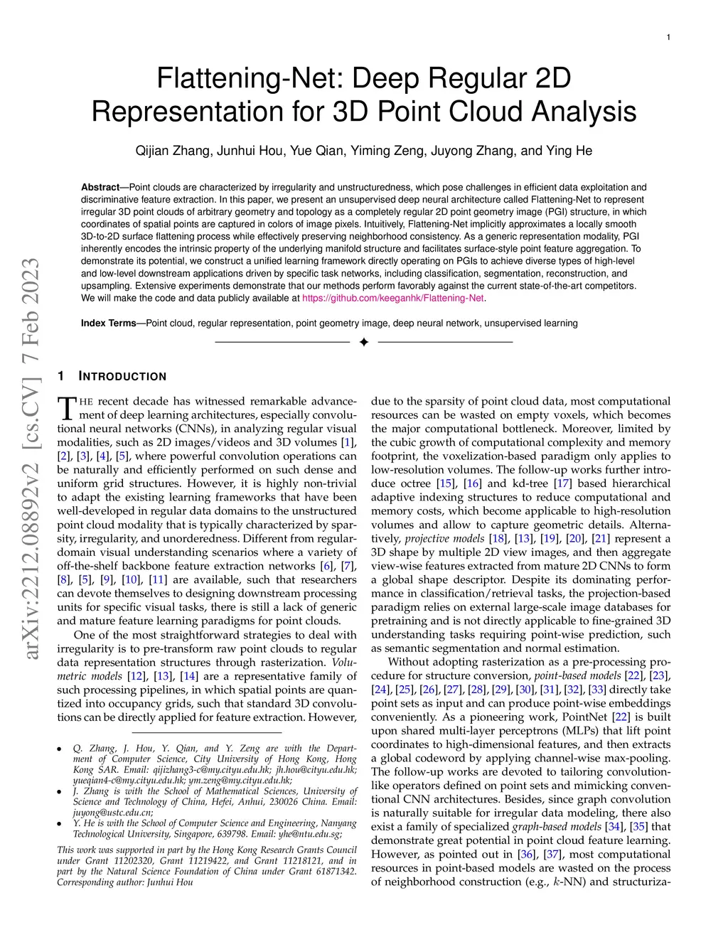 Point clouds are characterized by irregularity and unstructuredness, which pose challenges in efficient data exploitation and discriminative feature extraction. In this paper, we present an unsupervised deep neural architecture called Flattening-Net to represent irregular 3D point clouds of arbitrary geometry and topology as a completely regular 2D point geometry image (PGI) structure, in which coordinates of spatial points are captured in colors of image pixels. \mr{Intuitively, Flattening-Net implicitly approximates a locally smooth 3D-to-2D surface flattening process while effectively preserving neighborhood consistency.} \mr{As a generic representation modality, PGI inherently encodes the intrinsic property of the underlying manifold structure and facilitates surface-style point feature aggregation.} To demonstrate its potential, we construct a unified learning framework directly operating on PGIs to achieve \mr{diverse types of high-level and low-level} downstream applications driven by specific task networks, including classification, segmentation, reconstruction, and upsampling. Extensive experiments demonstrate that our methods perform favorably against the current state-of-the-art competitors. We will make the code and data publicly available at https://github.com/keeganhk/Flattening-Net.