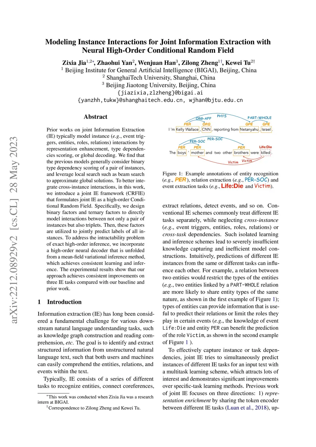 Prior works on joint Information Extraction (IE) typically model instance (e.g., event triggers, entities, roles, relations) interactions by representation enhancement, type dependencies scoring, or global decoding. We find that the previous models generally consider binary type dependency scoring of a pair of instances, and leverage local search such as beam search to approximate global solutions. To better integrate cross-instance interactions, in this work, we introduce a joint IE framework (CRFIE) that formulates joint IE as a high-order Conditional Random Field. Specifically, we design binary factors and ternary factors to directly model interactions between not only a pair of instances but also triplets. Then, these factors are utilized to jointly predict labels of all instances. To address the intractability problem of exact high-order inference, we incorporate a high-order neural decoder that is unfolded from a mean-field variational inference method, which achieves consistent learning and inference. The experimental results show that our approach achieves consistent improvements on three IE tasks compared with our baseline and prior work.