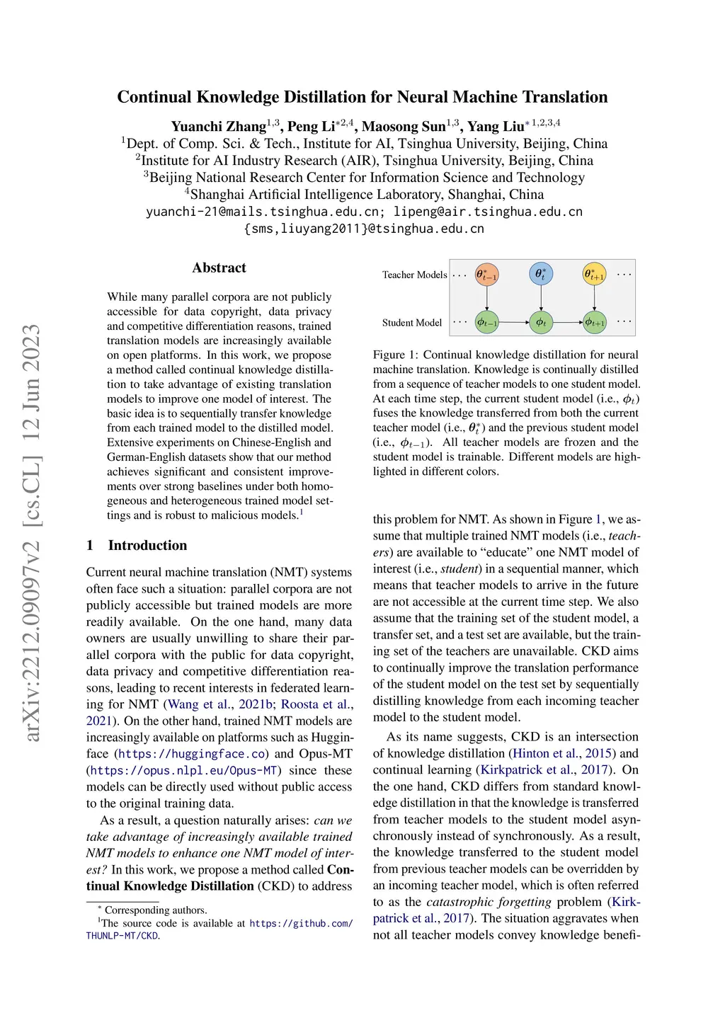 While many parallel corpora are not publicly accessible for data copyright, data privacy and competitive differentiation reasons, trained translation models are increasingly available on open platforms. In this work, we propose a method called continual knowledge distillation to take advantage of existing translation models to improve one model of interest. The basic idea is to sequentially transfer knowledge from each trained model to the distilled model. Extensive experiments on Chinese-English and German-English datasets show that our method achieves significant and consistent improvements over strong baselines under both homogeneous and heterogeneous trained model settings and is robust to malicious models.