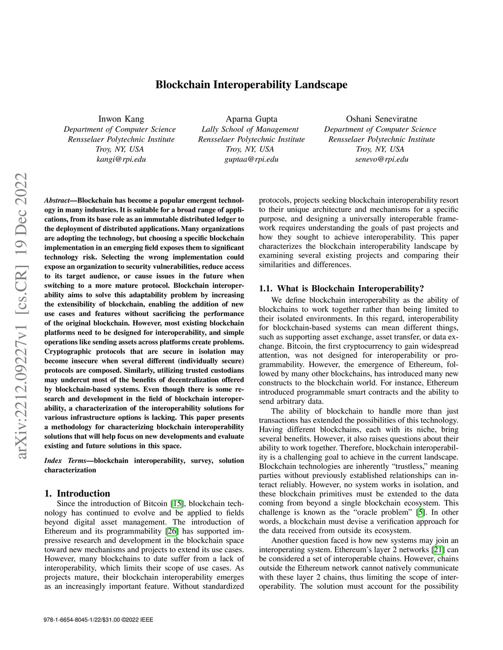 Blockchain has become a popular emergent technology in many industries. It is suitable for a broad range of applications, from its base role as an immutable distributed ledger to the deployment of distributed applications. Many organizations are adopting the technology, but choosing a specific blockchain implementation in an emerging field exposes them to significant technology risk. Selecting the wrong implementation could expose an organization to security vulnerabilities, reduce access to its target audience, or cause issues in the future when switching to a more mature protocol. Blockchain interoperability aims to solve this adaptability problem by increasing the extensibility of blockchain, enabling the addition of new use cases and features without sacrificing the performance of the original blockchain. However, most existing blockchain platforms need to be designed for interoperability, and simple operations like sending assets across platforms create problems. Cryptographic protocols that are secure in isolation may become insecure when several different (individually secure) protocols are composed. Similarly, utilizing trusted custodians may undercut most of the benefits of decentralization offered by blockchain-based systems. Even though there is some research and development in the field of blockchain interoperability, a characterization of the interoperability solutions for various infrastructure options is lacking. This paper presents a methodology for characterizing blockchain interoperability solutions that will help focus on new developments and evaluate existing and future solutions in this space.
