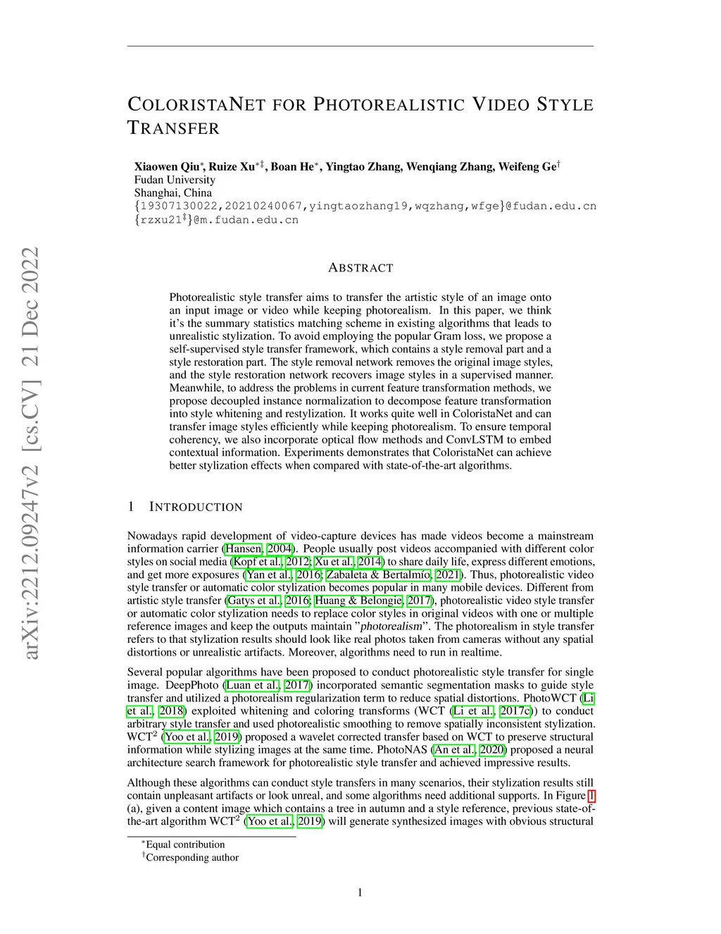 Photorealistic style transfer aims to transfer the artistic style of an image onto an input image or video while keeping photorealism. In this paper, we think it's the summary statistics matching scheme in existing algorithms that leads to unrealistic stylization. To avoid employing the popular Gram loss, we propose a self-supervised style transfer framework, which contains a style removal part and a style restoration part. The style removal network removes the original image styles, and the style restoration network recovers image styles in a supervised manner. Meanwhile, to address the problems in current feature transformation methods, we propose decoupled instance normalization to decompose feature transformation into style whitening and restylization. It works quite well in ColoristaNet and can transfer image styles efficiently while keeping photorealism. To ensure temporal coherency, we also incorporate optical flow methods and ConvLSTM to embed contextual information. Experiments demonstrates that ColoristaNet can achieve better stylization effects when compared with state-of-the-art algorithms.