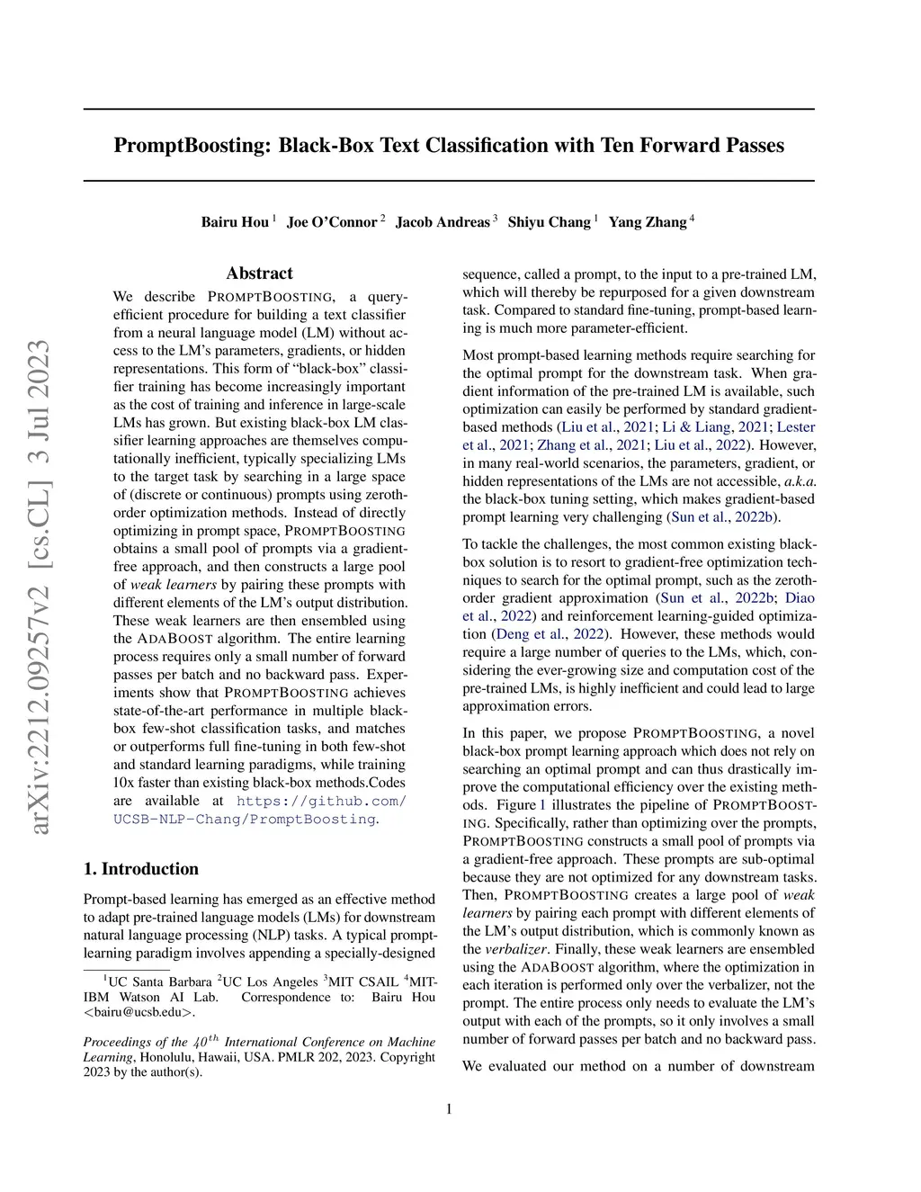 We describe PromptBoosting, a query-efficient procedure for building a text classifier from a neural language model (LM) without access to the LM's parameters, gradients, or hidden representations. This form of "black-box" classifier training has become increasingly important as the cost of training and inference in large-scale LMs grows. But existing black-box LM classifier learning approaches are themselves computationally inefficient, typically specializing LMs to the target task by searching in a large space of (discrete or continuous) prompts using zeroth-order optimization methods. Instead of directly optimizing in prompt space, PromptBoosting obtains a small pool of prompts via a gradient-free approach and then constructs a large pool of weak learners by pairing these prompts with different elements of the LM's output distribution. These weak learners are then ensembled using the AdaBoost algorithm. The entire learning process requires only a small number of forward passes and no backward pass. Experiments show that PromptBoosting achieves state-of-the-art performance in multiple black-box few-shot classification tasks, and matches or outperforms full fine-tuning in both few-shot and standard learning paradigms, while training 10x faster than existing black-box methods.