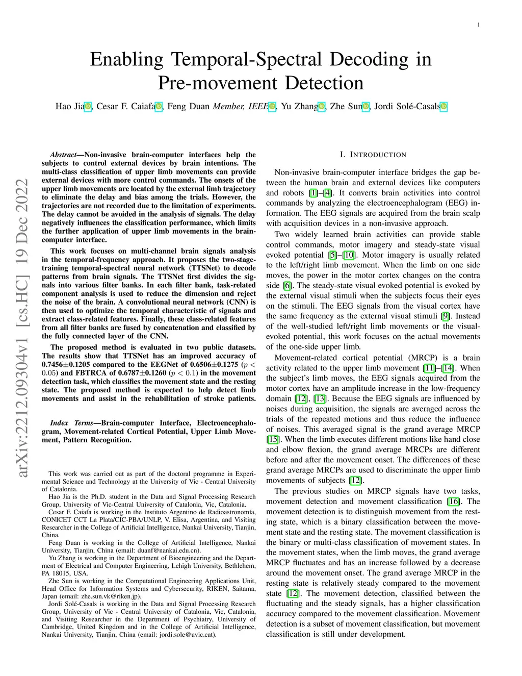 Non-invasive brain-computer interfaces help the subjects to control external devices by brain intentions. The multi-class classification of upper limb movements can provide external devices with more control commands. The onsets of the upper limb movements are located by the external limb trajectory to eliminate the delay and bias among the trials. However, the trajectories are not recorded due to the limitation of experiments. The delay cannot be avoided in the analysis of signals. The delay negatively influences the classification performance, which limits the further application of upper limb movements in the brain-computer interface. This work focuses on multi-channel brain signals analysis in the temporal-frequency approach. It proposes the two-stage-training temporal-spectral neural network (TTSNet) to decode patterns from brain signals. The TTSNet first divides the signals into various filter banks. In each filter bank, task-related component analysis is used to reduce the dimension and reject the noise of the brain. A convolutional neural network (CNN) is then used to optimize the temporal characteristic of signals and extract class-related features. Finally, these class-related features from all filter banks are fused by concatenation and classified by the fully connected layer of the CNN. The proposed method is evaluated in two public datasets. The results show that TTSNet has an improved accuracy of 0.74560.1205 compared to the EEGNet of 0.65060.1275 () and FBTRCA of 0.67870.1260 () in the movement detection task, which classifies the movement state and the resting state. The proposed method is expected to help detect limb movements and assist in the rehabilitation of stroke patients.