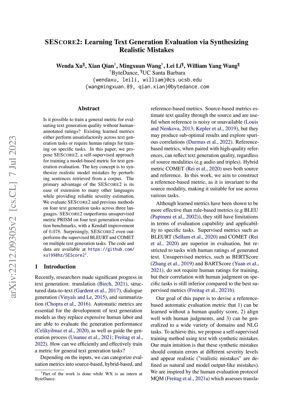 Is it possible to train a general metric for evaluating text generation quality without human annotated ratings? Existing learned metrics either perform unsatisfactorily across text generation tasks or require human ratings for training on specific tasks. In this paper, we propose SESCORE2, a self-supervised approach for training a model-based metric for text generation evaluation. The key concept is to synthesize realistic model mistakes by perturbing sentences retrieved from a corpus. The primary advantage of the SESCORE2 is its ease of extension to many other languages while providing reliable severity estimation. We evaluate SESCORE2 and previous methods on four text generation tasks across three languages. SESCORE2 outperforms unsupervised metric PRISM on four text generation evaluation benchmarks, with a Kendall improvement of 0.078. Surprisingly, SESCORE2 even outperforms the supervised BLEURT and COMET on multiple text generation tasks. The code and data are available at https://github.com/xu1998hz/SEScore2.