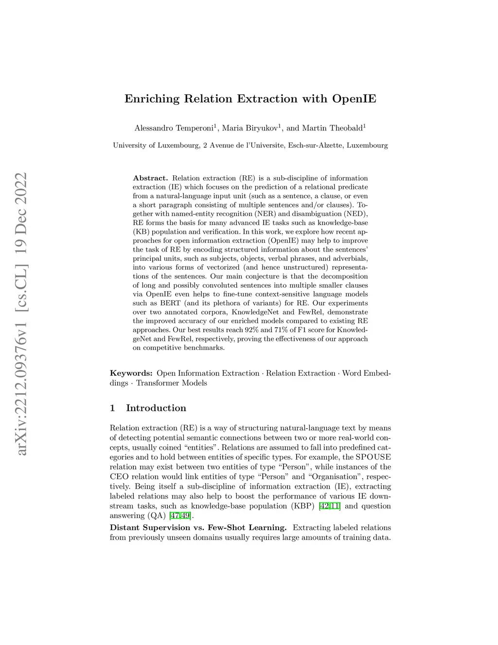 Relation extraction (RE) is a sub-discipline of information extraction (IE) which focuses on the prediction of a relational predicate from a natural-language input unit (such as a sentence, a clause, or even a short paragraph consisting of multiple sentences and/or clauses). Together with named-entity recognition (NER) and disambiguation (NED), RE forms the basis for many advanced IE tasks such as knowledge-base (KB) population and verification. In this work, we explore how recent approaches for open information extraction (OpenIE) may help to improve the task of RE by encoding structured information about the sentences' principal units, such as subjects, objects, verbal phrases, and adverbials, into various forms of vectorized (and hence unstructured) representations of the sentences. Our main conjecture is that the decomposition of long and possibly convoluted sentences into multiple smaller clauses via OpenIE even helps to fine-tune context-sensitive language models such as BERT (and its plethora of variants) for RE. Our experiments over two annotated corpora, KnowledgeNet and FewRel, demonstrate the improved accuracy of our enriched models compared to existing RE approaches. Our best results reach 92% and 71% of F1 score for KnowledgeNet and FewRel, respectively, proving the effectiveness of our approach on competitive benchmarks.