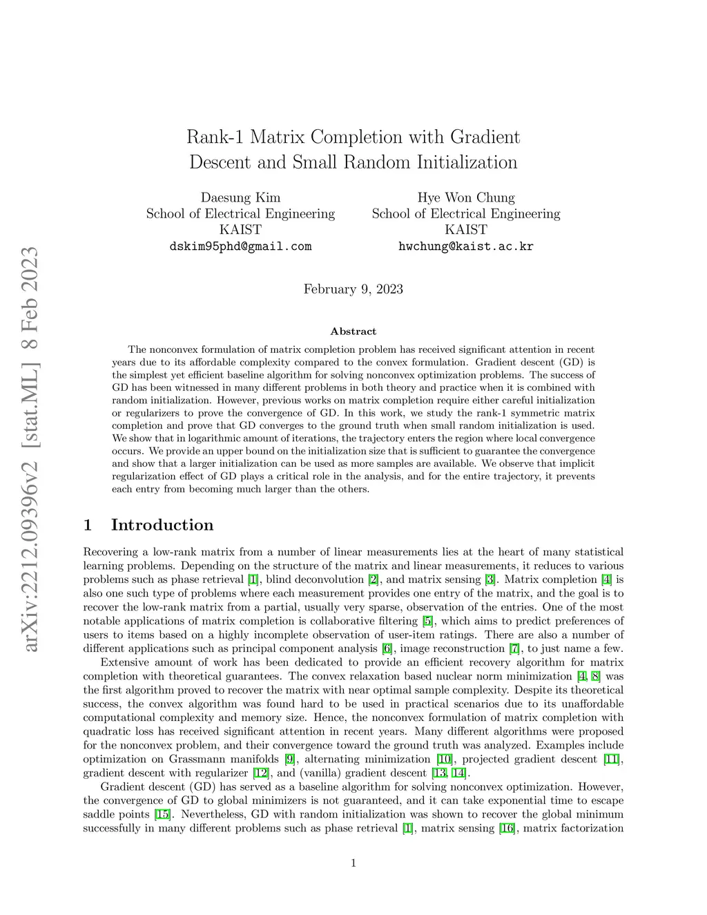 The nonconvex formulation of the matrix completion problem has received significant attention in recent years due to its affordable complexity compared to the convex formulation. Gradient Descent (GD) is a simple yet efficient baseline algorithm for solving nonconvex optimization problems. The success of GD has been witnessed in many different problems in both theory and practice when it is combined with random initialization. However, previous works on matrix completion require either careful initialization or regularizers to prove the convergence of GD. In this paper, we study the rank-1 symmetric matrix completion and prove that GD converges to the ground truth when small random initialization is used. We show that in a logarithmic number of iterations, the trajectory enters the region where local convergence occurs. We provide an upper bound on the initialization size that is sufficient to guarantee the convergence, and show that a larger initialization can be used as more samples are available. We observe that the implicit regularization effect of GD plays a critical role in the analysis, and for the entire trajectory, it prevents each entry from becoming much larger than the others.