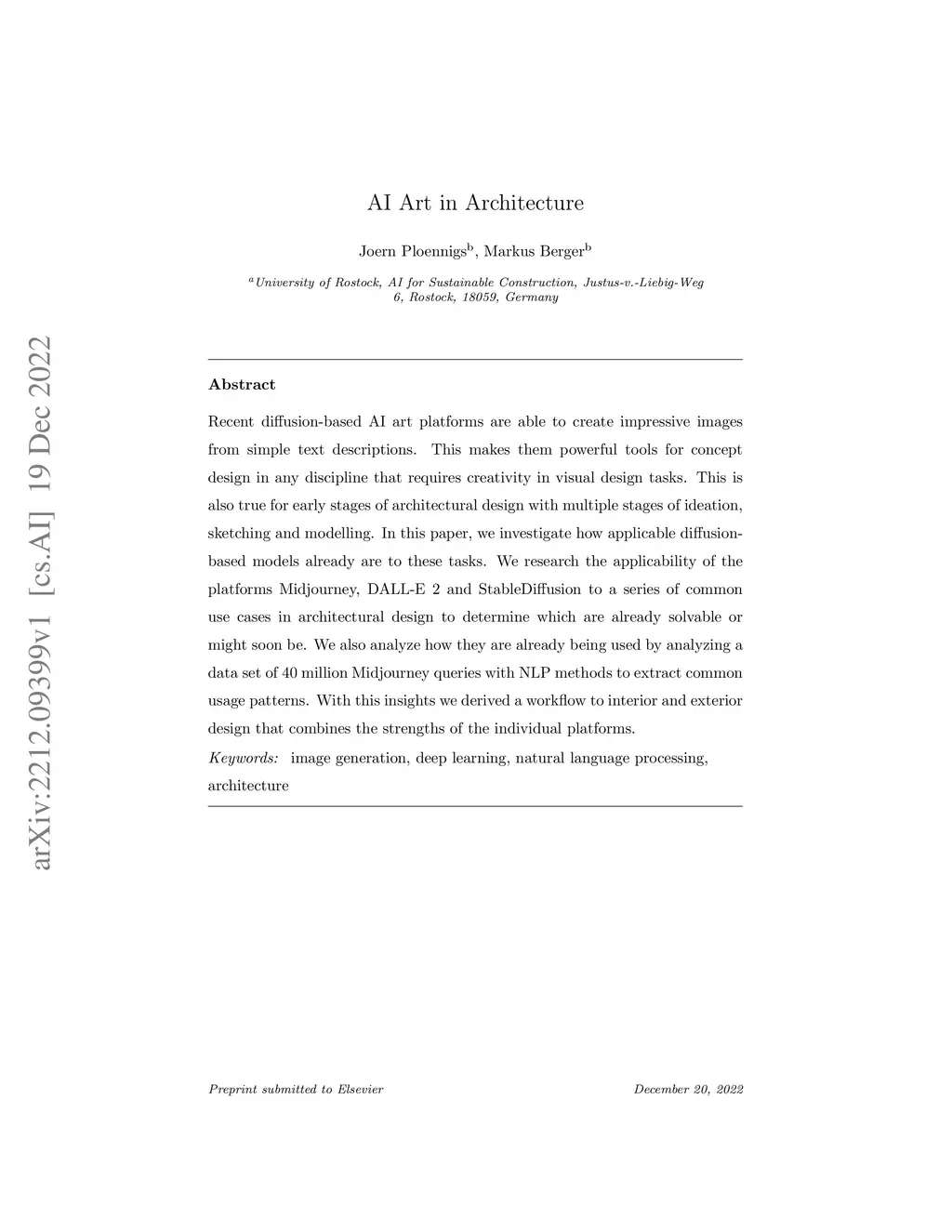 Recent diffusion-based AI art platforms are able to create impressive images from simple text descriptions. This makes them powerful tools for concept design in any discipline that requires creativity in visual design tasks. This is also true for early stages of architectural design with multiple stages of ideation, sketching and modelling. In this paper, we investigate how applicable diffusion-based models already are to these tasks. We research the applicability of the platforms Midjourney, DALL-E 2 and StableDiffusion to a series of common use cases in architectural design to determine which are already solvable or might soon be. We also analyze how they are already being used by analyzing a data set of 40 million Midjourney queries with NLP methods to extract common usage patterns. With this insights we derived a workflow to interior and exterior design that combines the strengths of the individual platforms.