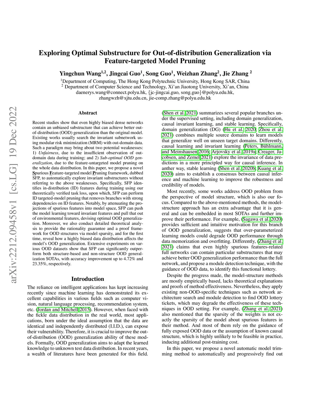 Recent studies show that even highly biased dense networks contain an unbiased substructure that can achieve better out-of-distribution (OOD) generalization than the original model. Existing works usually search the invariant subnetwork using modular risk minimization (MRM) with out-domain data. Such a paradigm may bring about two potential weaknesses: 1) Unfairness, due to the insufficient observation of out-domain data during training; and 2) Sub-optimal OOD generalization, due to the feature-untargeted model pruning on the whole data distribution. In this paper, we propose a novel Spurious Feature-targeted model Pruning framework, dubbed SFP, to automatically explore invariant substructures without referring to the above weaknesses. Specifically, SFP identifies in-distribution (ID) features during training using our theoretically verified task loss, upon which, SFP can perform ID targeted-model pruning that removes branches with strong dependencies on ID features. Notably, by attenuating the projections of spurious features into model space, SFP can push the model learning toward invariant features and pull that out of environmental features, devising optimal OOD generalization. Moreover, we also conduct detailed theoretical analysis to provide the rationality guarantee and a proof framework for OOD structures via model sparsity, and for the first time, reveal how a highly biased data distribution affects the model's OOD generalization. Extensive experiments on various OOD datasets show that SFP can significantly outperform both structure-based and non-structure OOD generalization SOTAs, with accuracy improvement up to 4.72% and 23.35%, respectively.