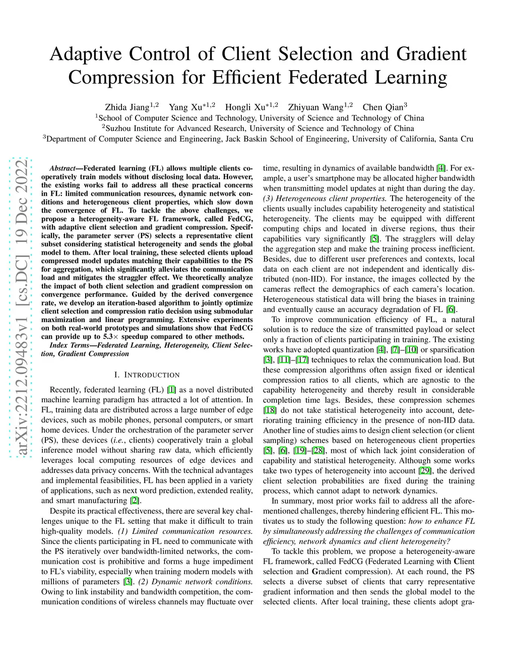 Federated learning (FL) allows multiple clients cooperatively train models without disclosing local data. However, the existing works fail to address all these practical concerns in FL: limited communication resources, dynamic network conditions and heterogeneous client properties, which slow down the convergence of FL. To tackle the above challenges, we propose a heterogeneity-aware FL framework, called FedCG, with adaptive client selection and gradient compression. Specifically, the parameter server (PS) selects a representative client subset considering statistical heterogeneity and sends the global model to them. After local training, these selected clients upload compressed model updates matching their capabilities to the PS for aggregation, which significantly alleviates the communication load and mitigates the straggler effect. We theoretically analyze the impact of both client selection and gradient compression on convergence performance. Guided by the derived convergence rate, we develop an iteration-based algorithm to jointly optimize client selection and compression ratio decision using submodular maximization and linear programming. Extensive experiments on both real-world prototypes and simulations show that FedCG can provide up to 5.3 speedup compared to other methods.
