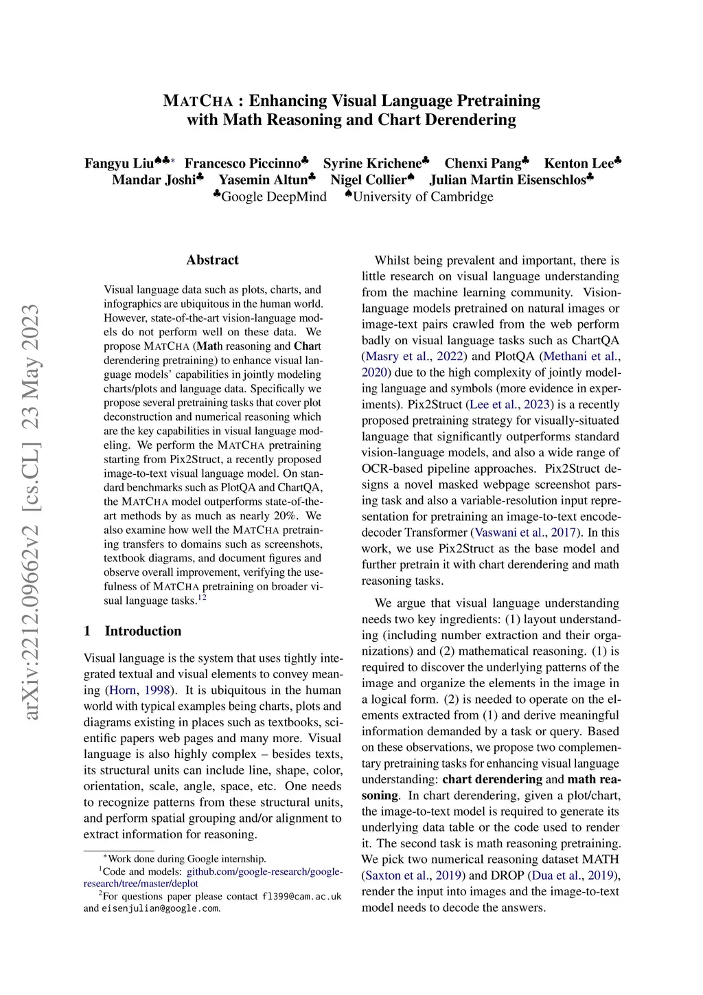 MatCha: Enhancing Visual Language Pretraining with Math Reasoning and