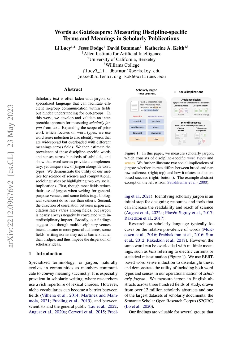 Scholarly text is often laden with jargon, or specialized language that can facilitate efficient in-group communication within fields but hinder understanding for out-groups. In this work, we develop and validate an interpretable approach for measuring scholarly jargon from text. Expanding the scope of prior work which focuses on word types, we use word sense induction to also identify words that are widespread but overloaded with different meanings across fields. We then estimate the prevalence of these discipline-specific words and senses across hundreds of subfields, and show that word senses provide a complementary, yet unique view of jargon alongside word types. We demonstrate the utility of our metrics for science of science and computational sociolinguistics by highlighting two key social implications. First, though most fields reduce their use of jargon when writing for general-purpose venues, and some fields (e.g., biological sciences) do so less than others. Second, the direction of correlation between jargon and citation rates varies among fields, but jargon is nearly always negatively correlated with interdisciplinary impact. Broadly, our findings suggest that though multidisciplinary venues intend to cater to more general audiences, some fields' writing norms may act as barriers rather than bridges, and thus impede the dispersion of scholarly ideas.