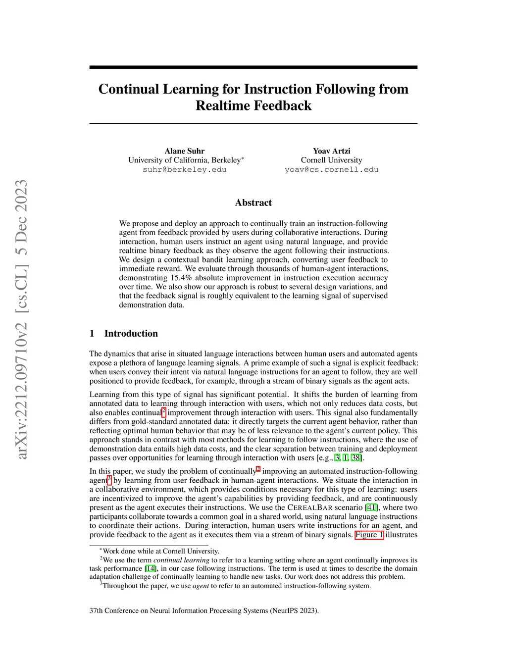 We propose and deploy an approach to continually train an instruction-following agent from feedback provided by users during collaborative interactions. During interaction, human users instruct an agent using natural language, and provide realtime binary feedback as they observe the agent following their instructions. We design a contextual bandit learning approach, converting user feedback to immediate reward. We evaluate through thousands of human-agent interactions, demonstrating 15.4% absolute improvement in instruction execution accuracy over time. We also show our approach is robust to several design variations, and that the feedback signal is roughly equivalent to the learning signal of supervised demonstration data.