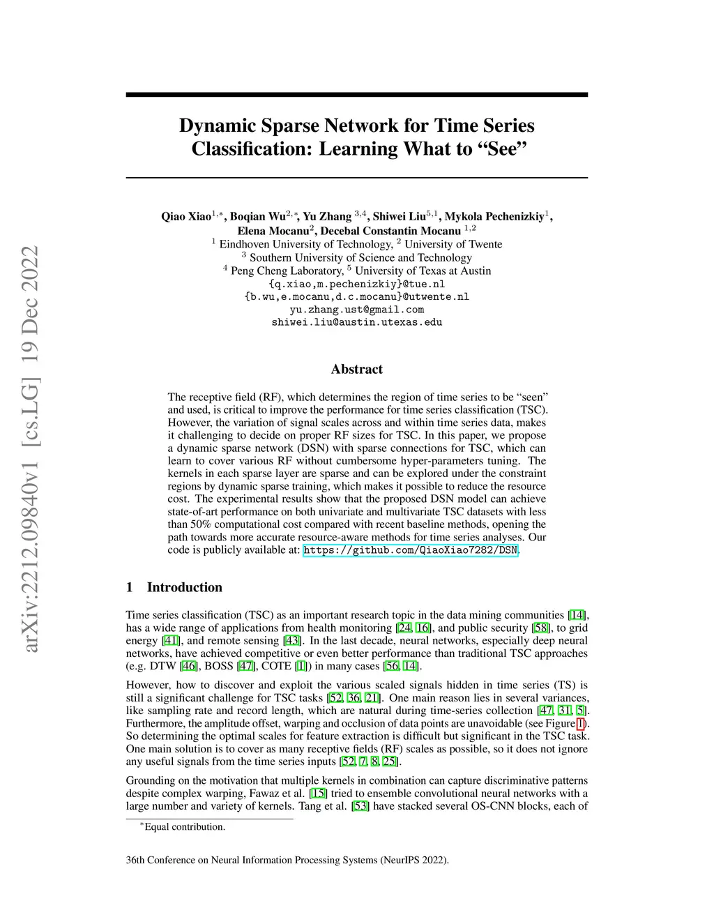 Dynamic Sparse Network for Time Series Classification: Learning What to