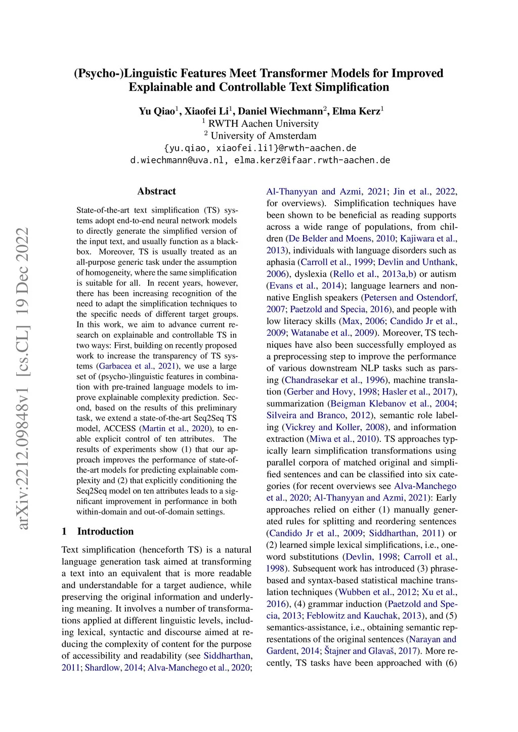 State-of-the-art text simplification (TS) systems adopt end-to-end neural network models to directly generate the simplified version of the input text, and usually function as a blackbox. Moreover, TS is usually treated as an all-purpose generic task under the assumption of homogeneity, where the same simplification is suitable for all. In recent years, however, there has been increasing recognition of the need to adapt the simplification techniques to the specific needs of different target groups. In this work, we aim to advance current research on explainable and controllable TS in two ways: First, building on recently proposed work to increase the transparency of TS systems, we use a large set of (psycho-)linguistic features in combination with pre-trained language models to improve explainable complexity prediction. Second, based on the results of this preliminary task, we extend a state-of-the-art Seq2Seq TS model, ACCESS, to enable explicit control of ten attributes. The results of experiments show (1) that our approach improves the performance of state-of-the-art models for predicting explainable complexity and (2) that explicitly conditioning the Seq2Seq model on ten attributes leads to a significant improvement in performance in both within-domain and out-of-domain settings.