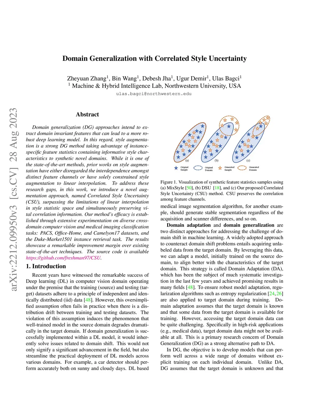 Domain generalization (DG) approaches intend to extract domain invariant features that can lead to a more robust deep learning model. In this regard, style augmentation is a strong DG method taking advantage of instance-specific feature statistics containing informative style characteristics to synthetic novel domains. While it is one of the state-of-the-art methods, prior works on style augmentation have either disregarded the interdependence amongst distinct feature channels or have solely constrained style augmentation to linear interpolation. To address these research gaps, in this work, we introduce a novel augmentation approach, named Correlated Style Uncertainty (CSU), surpassing the limitations of linear interpolation in style statistic space and simultaneously preserving vital correlation information. Our method's efficacy is established through extensive experimentation on diverse cross-domain computer vision and medical imaging classification tasks: PACS, Office-Home, and Camelyon17 datasets, and the Duke-Market1501 instance retrieval task. The results showcase a remarkable improvement margin over existing state-of-the-art techniques. The source code is available https://github.com/freshman97/CSU.