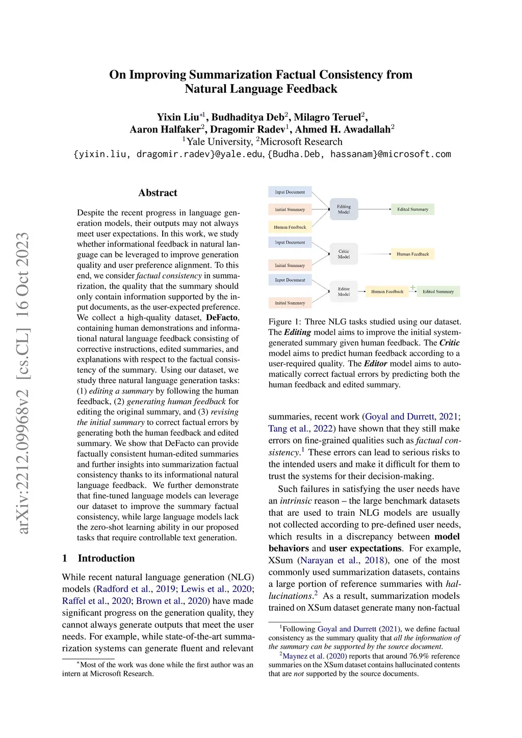 Despite the recent progress in language generation models, their outputs may not always meet user expectations. In this work, we study whether informational feedback in natural language can be leveraged to improve generation quality and user preference alignment. To this end, we consider factual consistency in summarization, the quality that the summary should only contain information supported by the input documents, as the user-expected preference. We collect a high-quality dataset, DeFacto, containing human demonstrations and informational natural language feedback consisting of corrective instructions, edited summaries, and explanations with respect to the factual consistency of the summary. Using our dataset, we study three natural language generation tasks: (1) editing a summary by following the human feedback, (2) generating human feedback for editing the original summary, and (3) revising the initial summary to correct factual errors by generating both the human feedback and edited summary. We show that DeFacto can provide factually consistent human-edited summaries and further insights into summarization factual consistency thanks to its informational natural language feedback. We further demonstrate that fine-tuned language models can leverage our dataset to improve the summary factual consistency, while large language models lack the zero-shot learning ability in our proposed tasks that require controllable text generation.